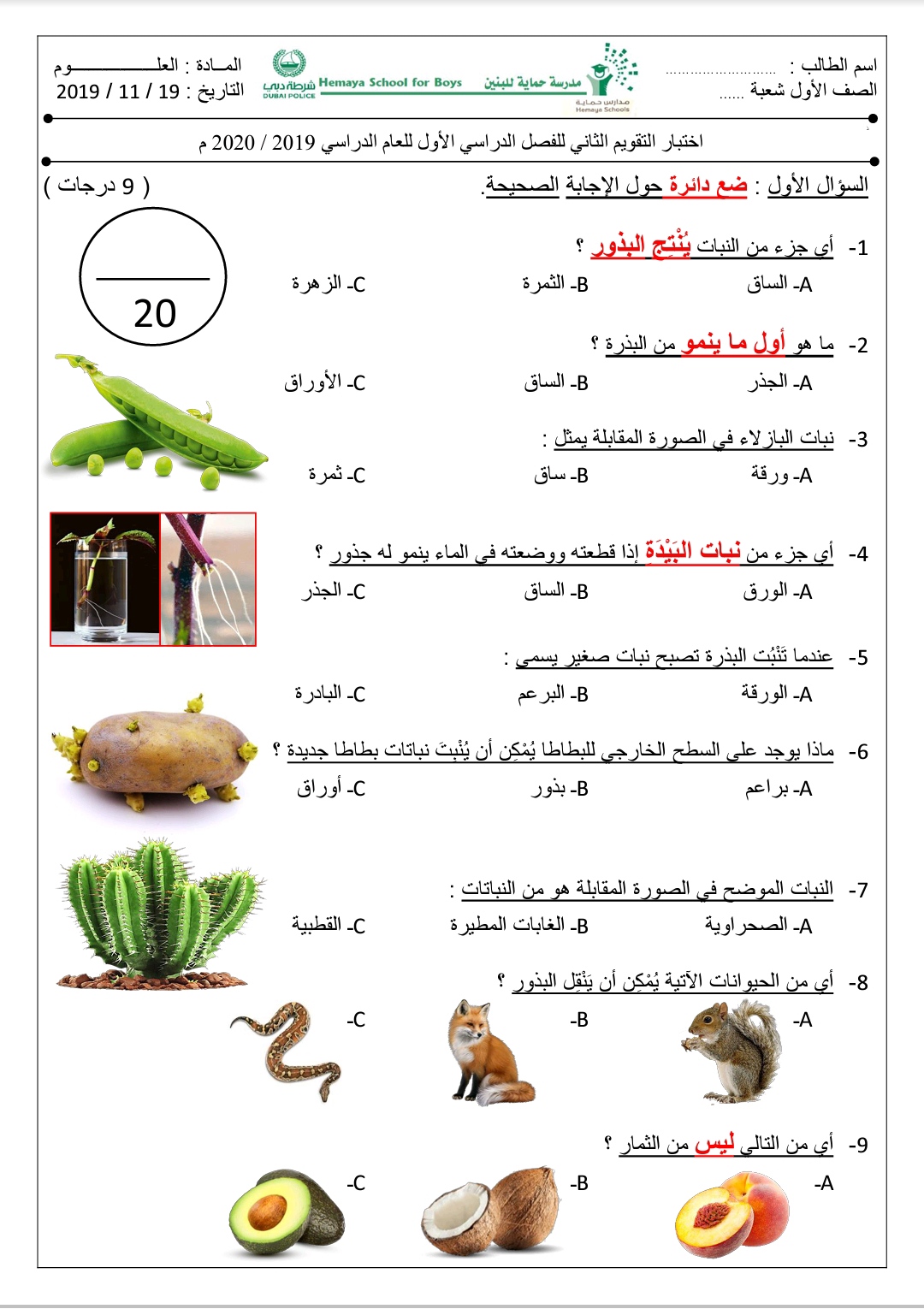 أنت هنا: موقع المناهجالمناهج الإماراتية الصف الأول علوم الفصل الأول اختبارات