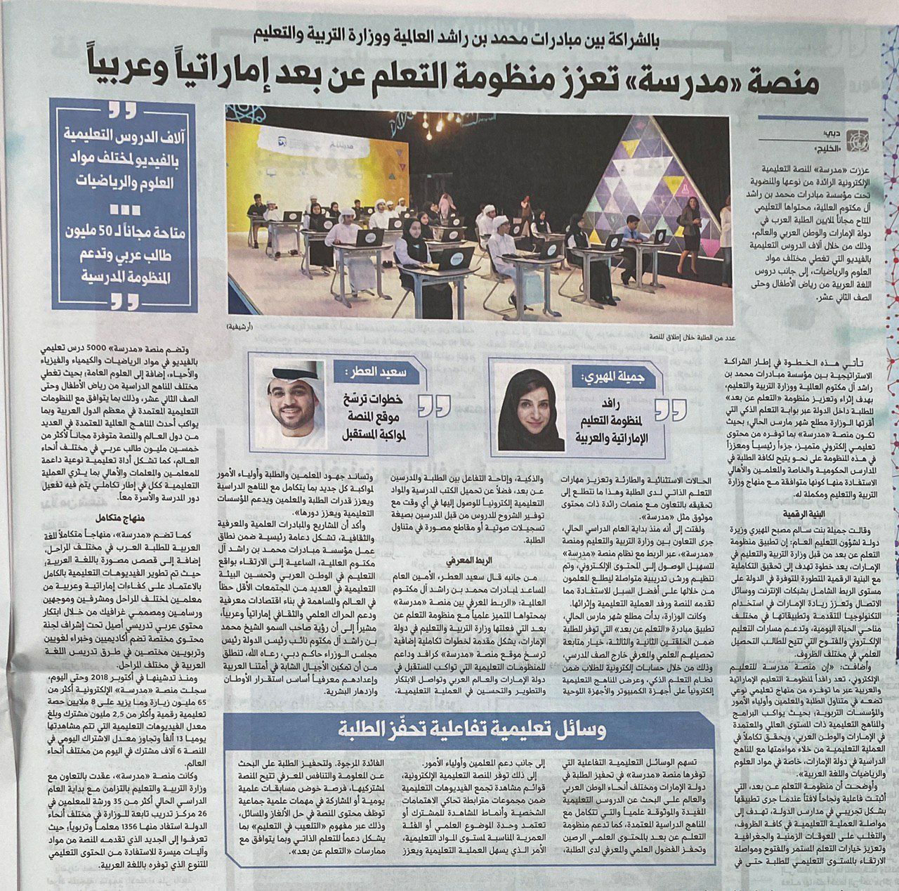 معلومات الملف: تزامناً مع تطبيق وزارة التربية والتعليم في دولة الإمارات منظومة «التعلّم عن بعد»، بما يتيح للطلبة متابعة دروسهم خارج الفصل المدرسي، عززت «مدرسة»، المنصة التعليمية الإلكترونية الرائدة من نوعها، والمنضوية تحت مؤسسة مبادرات محمد بن راشد آل مكتوم العالمية، محتواها التعليمي المتاح مجاناً لملايين للطلبة العرب في دولة الإمارات والوطن العربي والعالم، وذلك من خلال آلاف الدروس التعليمية بالفيديو التي تغطي مختلف مواد العلوم والرياضيات إلى جانب دروس اللغة العربية، من رياض الأطفال وحتى الصف الثاني عشر. | ||