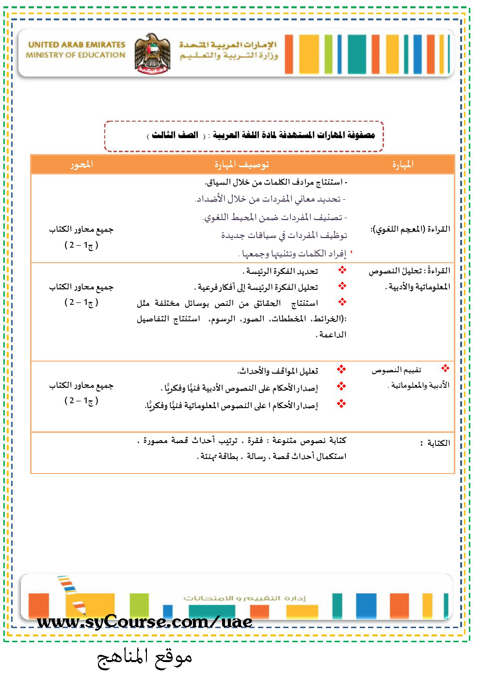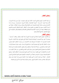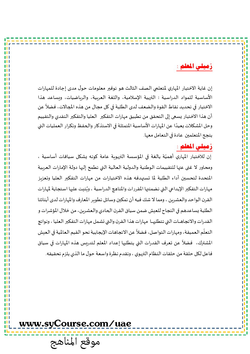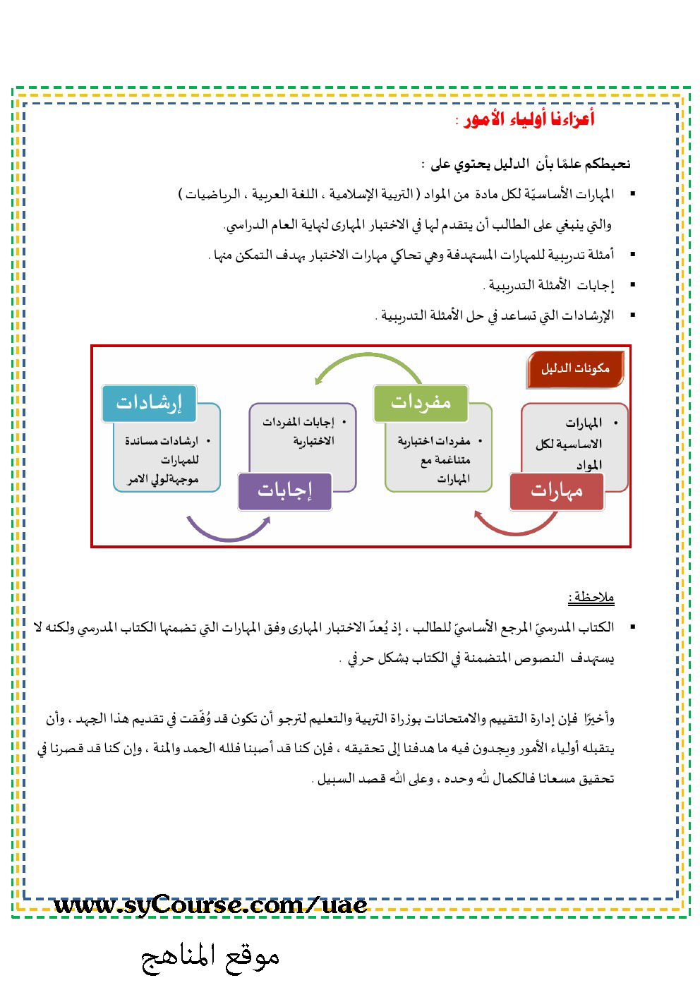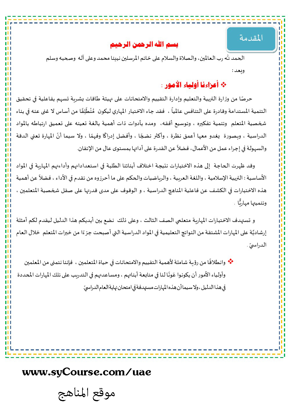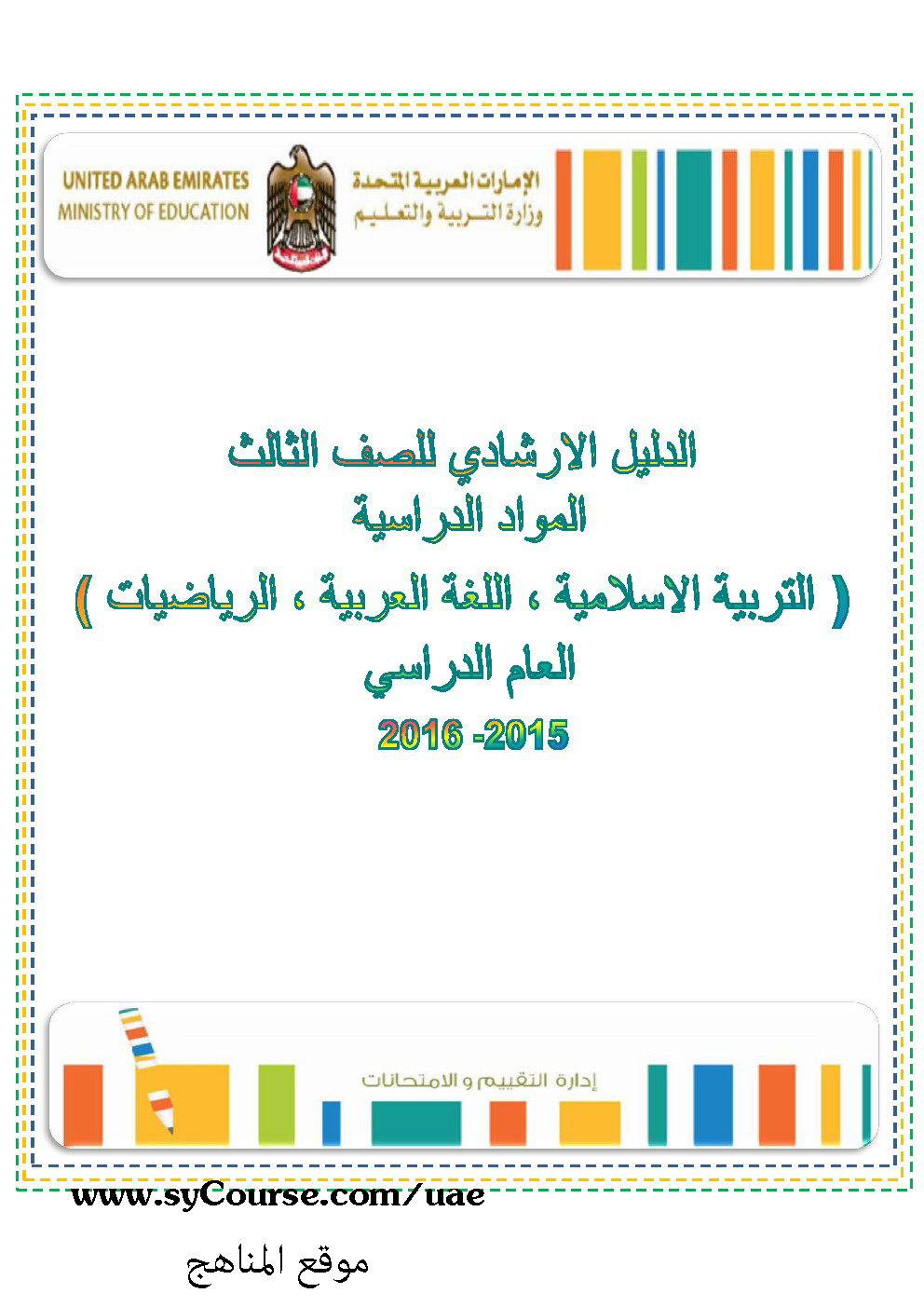 الامارات العربية المتحدة - وزارة التربية والتعليم- ادارة التقييم والامتحانات الدليل الارشادي للصف الثالث للمواد(تربية اسلامية ولغة عربية ورياضيات) يحوي المطلوب والمقرر من كل مادة من الجزأين الأول والثاني من الكتاب, حيث تم التركيز على مهارات معينة مع أمثلة: للتحميل على شكل كتاب الكتروني اتبع الرابط: https://www.moe.gov.ae/Arabic/Docs/Assessment/2016/%D8%A7%D9%84%D8%AF%D9%84%D9%8A%D9%84%20%D8%A7%D9%84%D8%A7%D8%B1%D8%B4%D8%A7%D8%AF%D9%8A%20%D9%84%D9%84%D8%B5%D9%81%20%D8%A7%D9%84%D8%AB%D8%A7%D9%84%D8%AB.pdf | ||