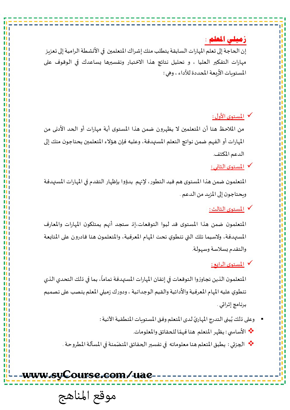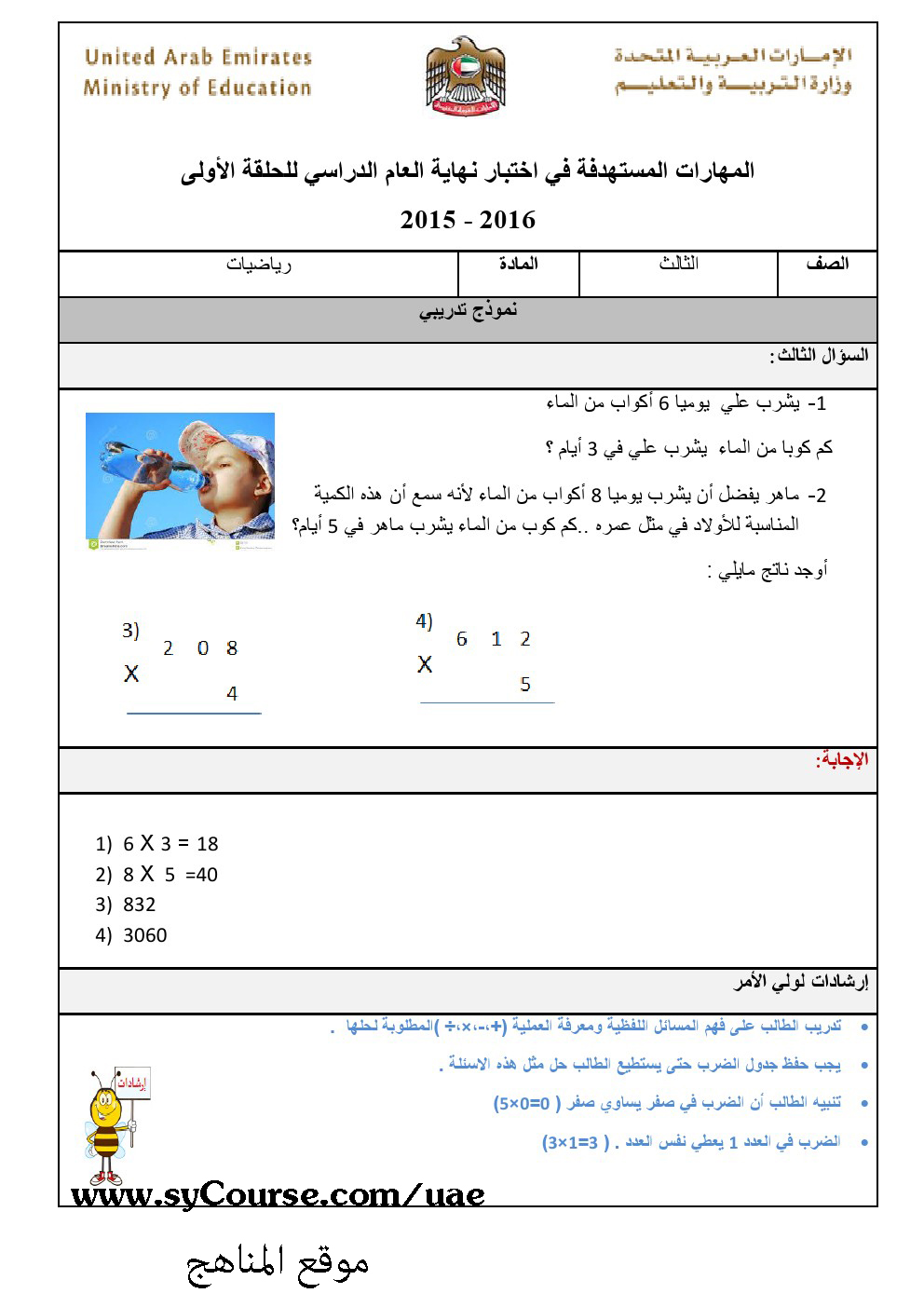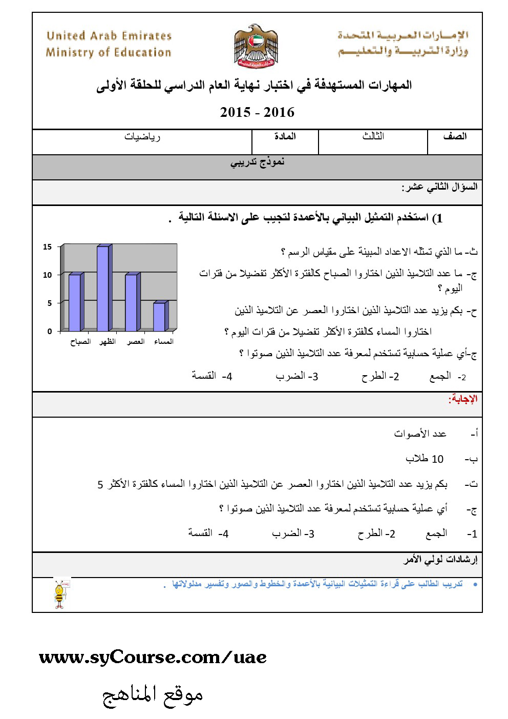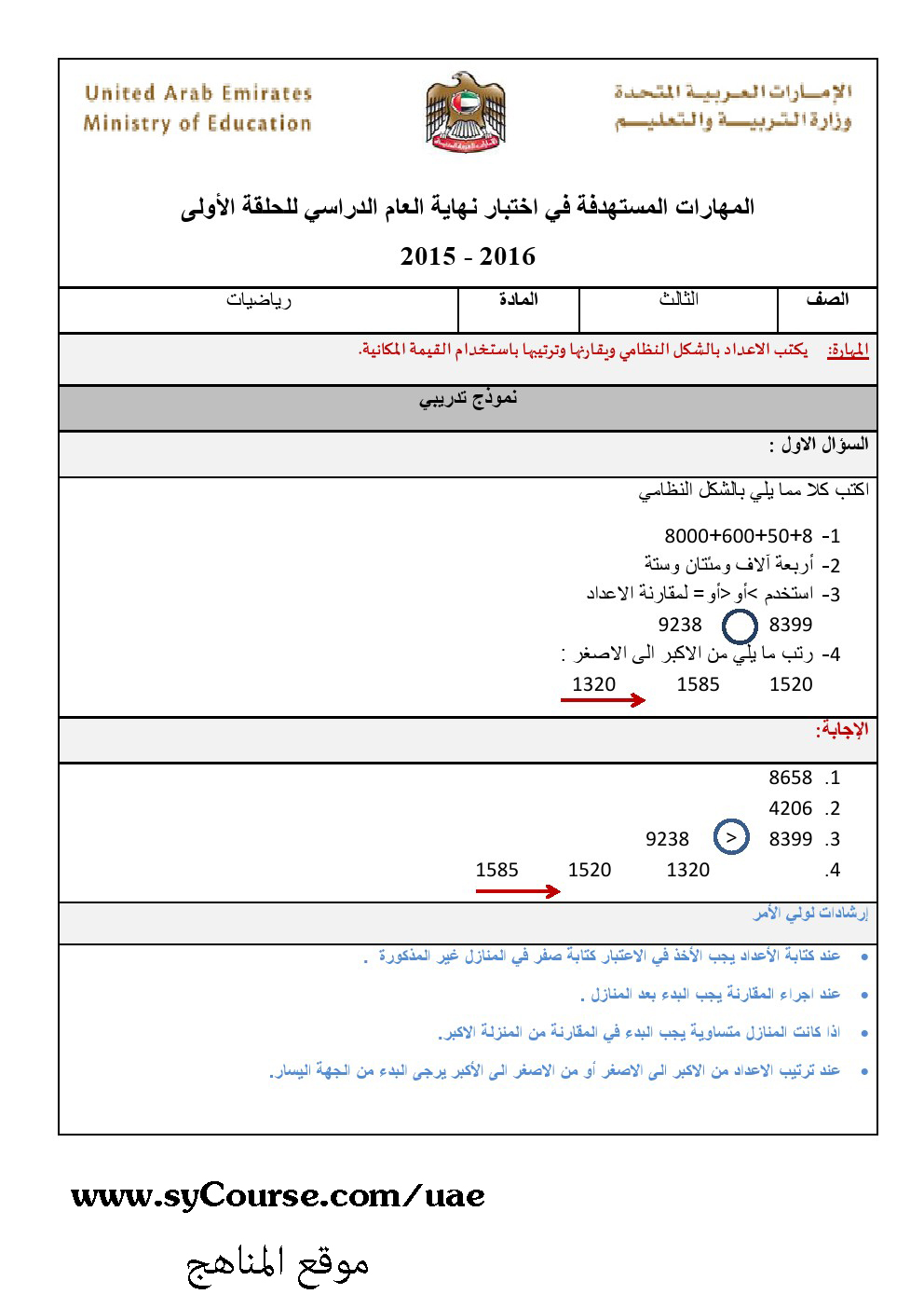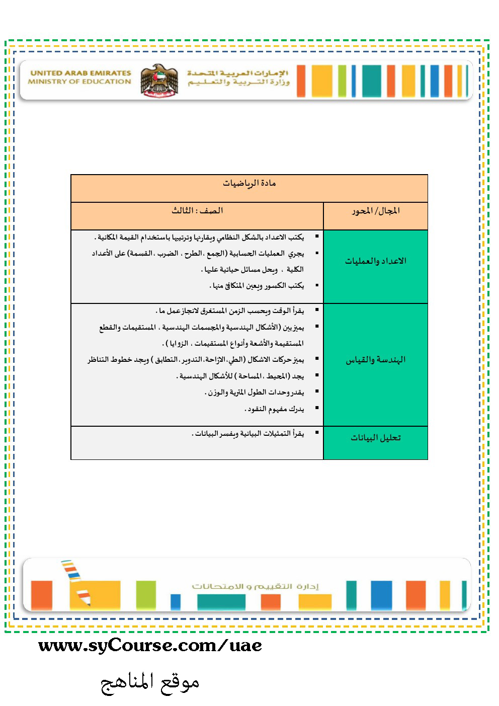 الامارات العربية المتحدة - وزارة التربية والتعليم- ادارة التقييم والامتحانات الدليل الارشادي للصف الثالث للمواد(تربية اسلامية ولغة عربية ورياضيات) يحوي المطلوب والمقرر من كل مادة من الجزأين الأول والثاني من الكتاب, حيث تم التركيز على مهارات معينة مع أمثلة: للتحميل على شكل كتاب الكتروني اتبع الرابط: https://www.moe.gov.ae/Arabic/Docs/Assessment/2016/%D8%A7%D9%84%D8%AF%D9%84%D9%8A%D9%84%20%D8%A7%D9%84%D8%A7%D8%B1%D8%B4%D8%A7%D8%AF%D9%8A%20%D9%84%D9%84%D8%B5%D9%81%20%D8%A7%D9%84%D8%AB%D8%A7%D9%84%D8%AB.pdf | ||