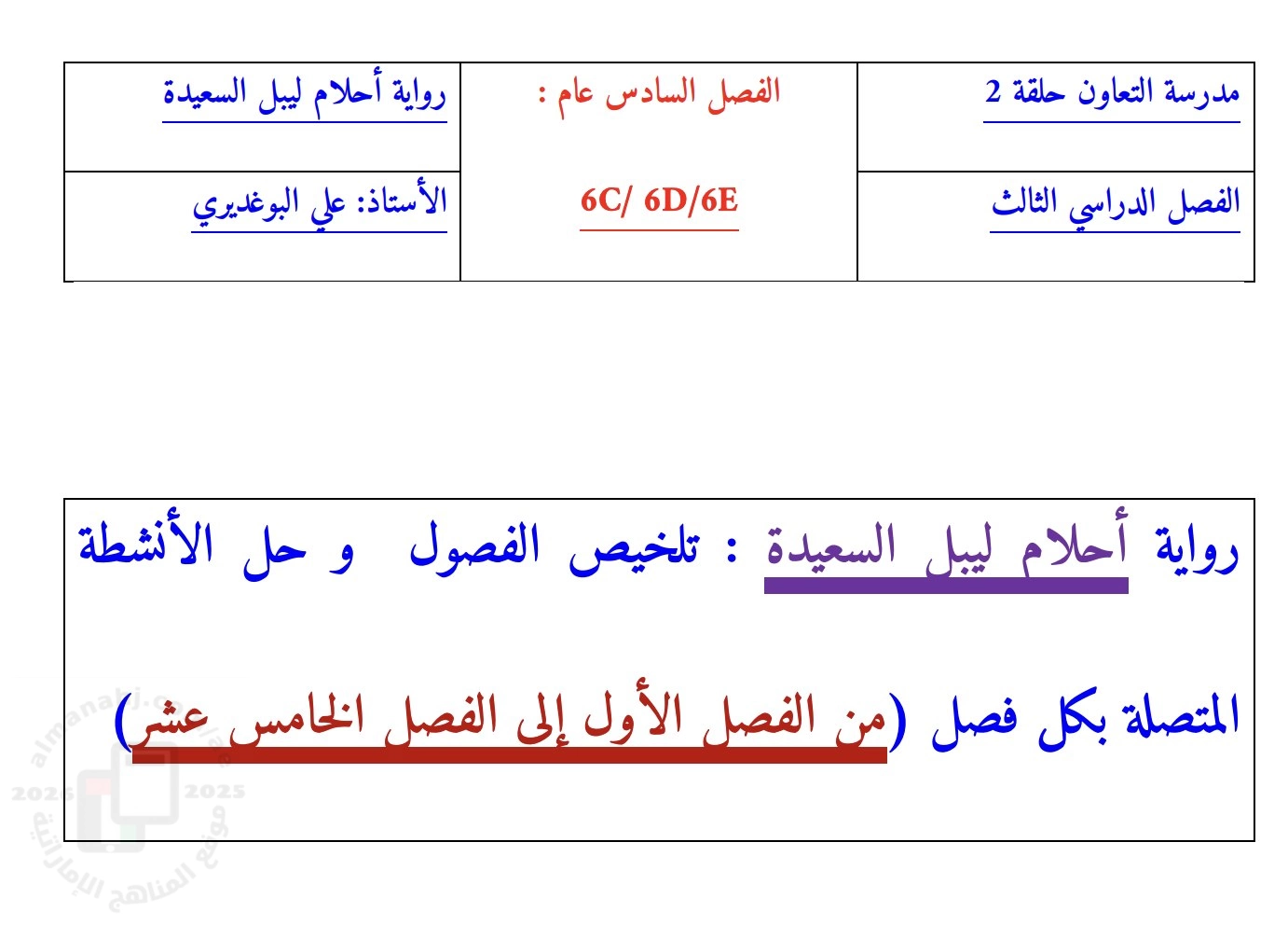 يحتوي الملف المرفق على تلخيص وحل أنشطة الفصول من الأول إلى الخامس عشر من رواية أحلام ليبل السعيدة، وهو للصف السادس في مادة اللغة العربية، ويتضمن تلخيص مايلي: