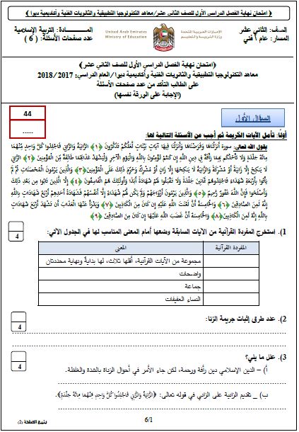 امتحان نهاية الفصل الأول للصف الثاني عشر (2017~2018), معاهد التكنولوجيا التطبيقية والثانويات الفنية وأكاديمية ديوا, الصف الثاني عشر العام, تربية اسلامية, الفصل الأول, 2016-2017 - المناهج الإماراتية