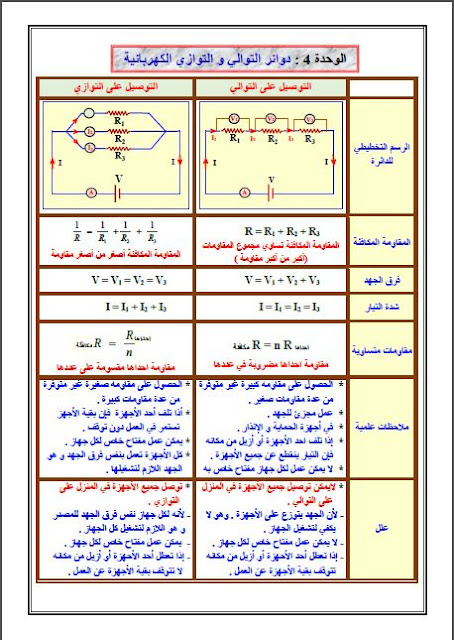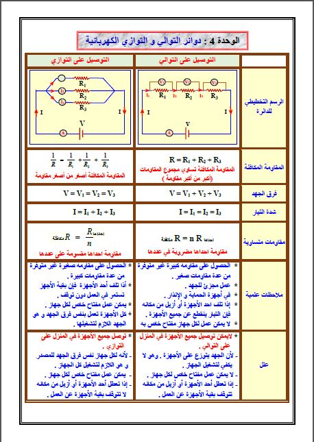 ملخص وتدريبات ومخططات مفاهيمية في دوائر التوالي والتوازي الكهربائية