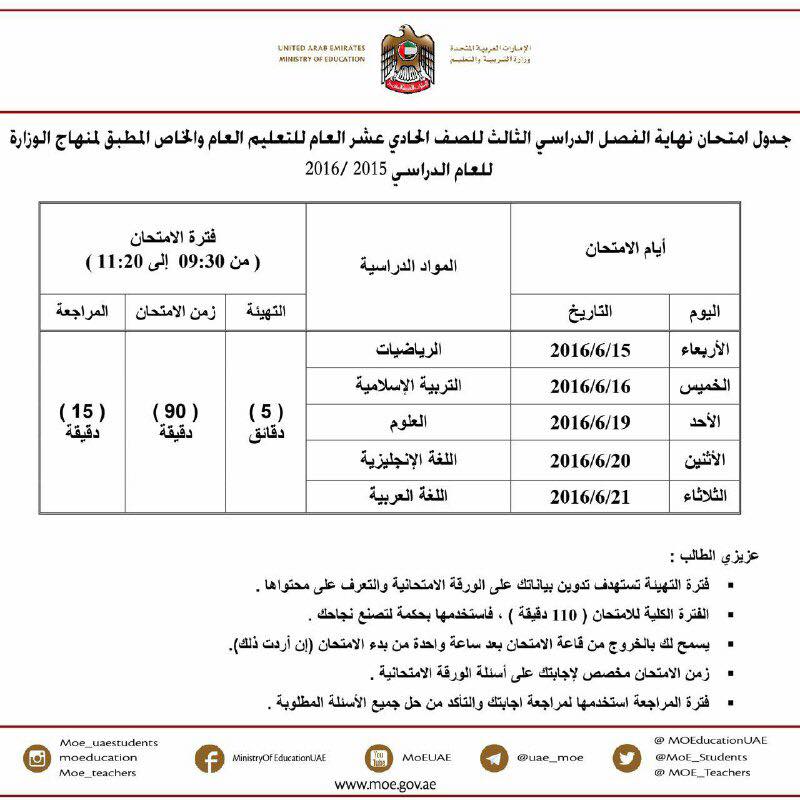 | جدول امتحان نهاية الفصل الدراسي الثالث للصف الحادي عشر - منهاج وزارة 2016 | ||