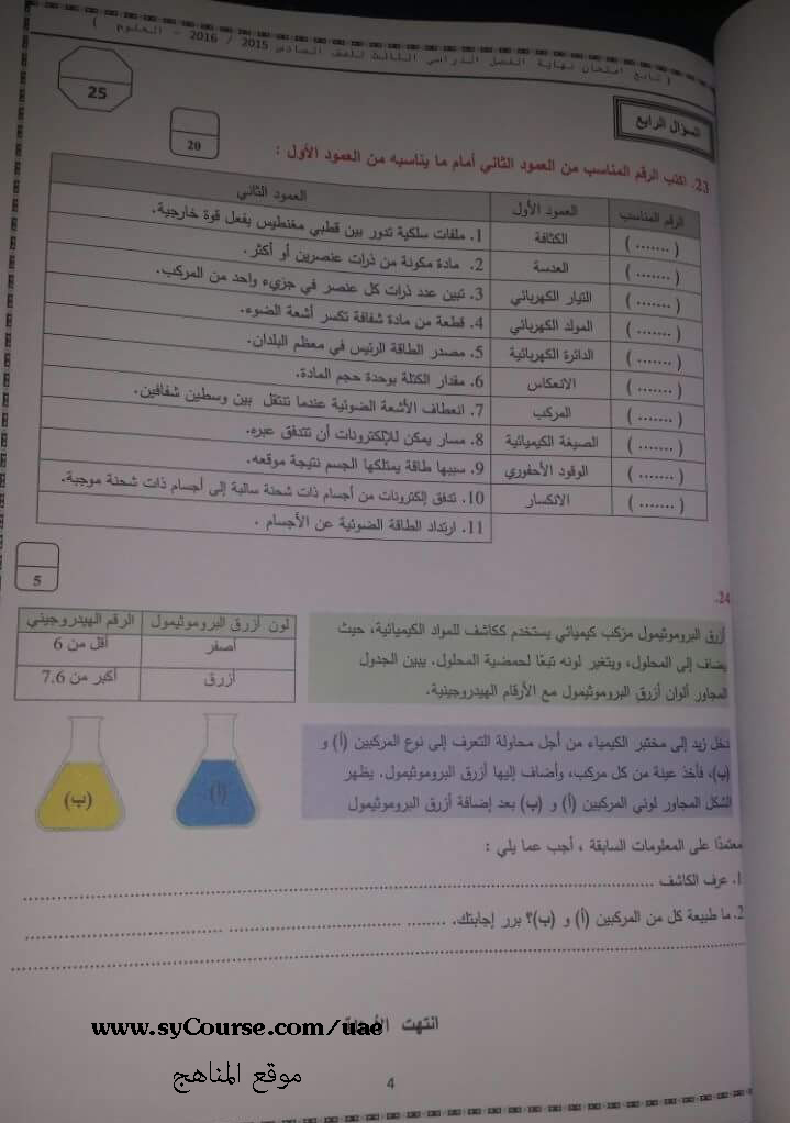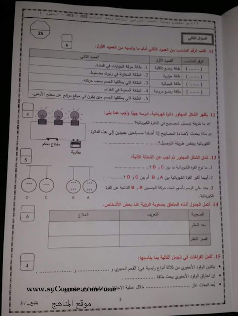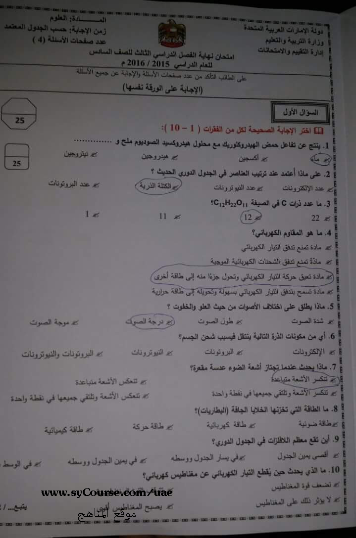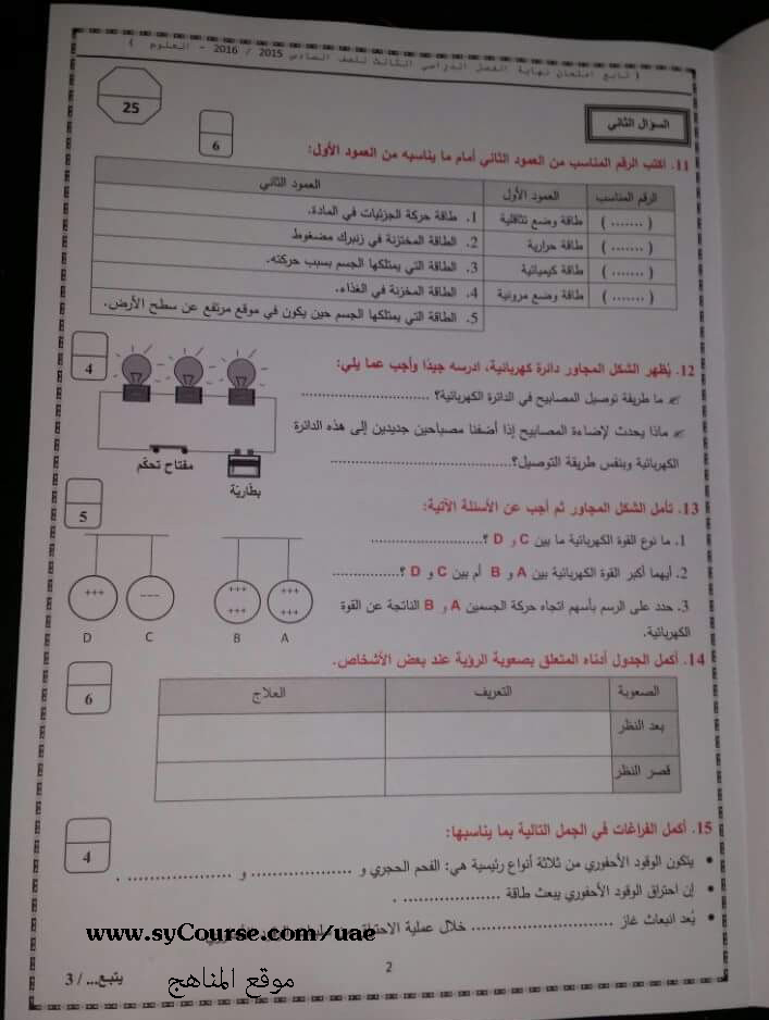 معلومات الملف: الامارات - الصف السادس- الفصل الثالث- علوم- أسئلة الامتحان 2016 | ||