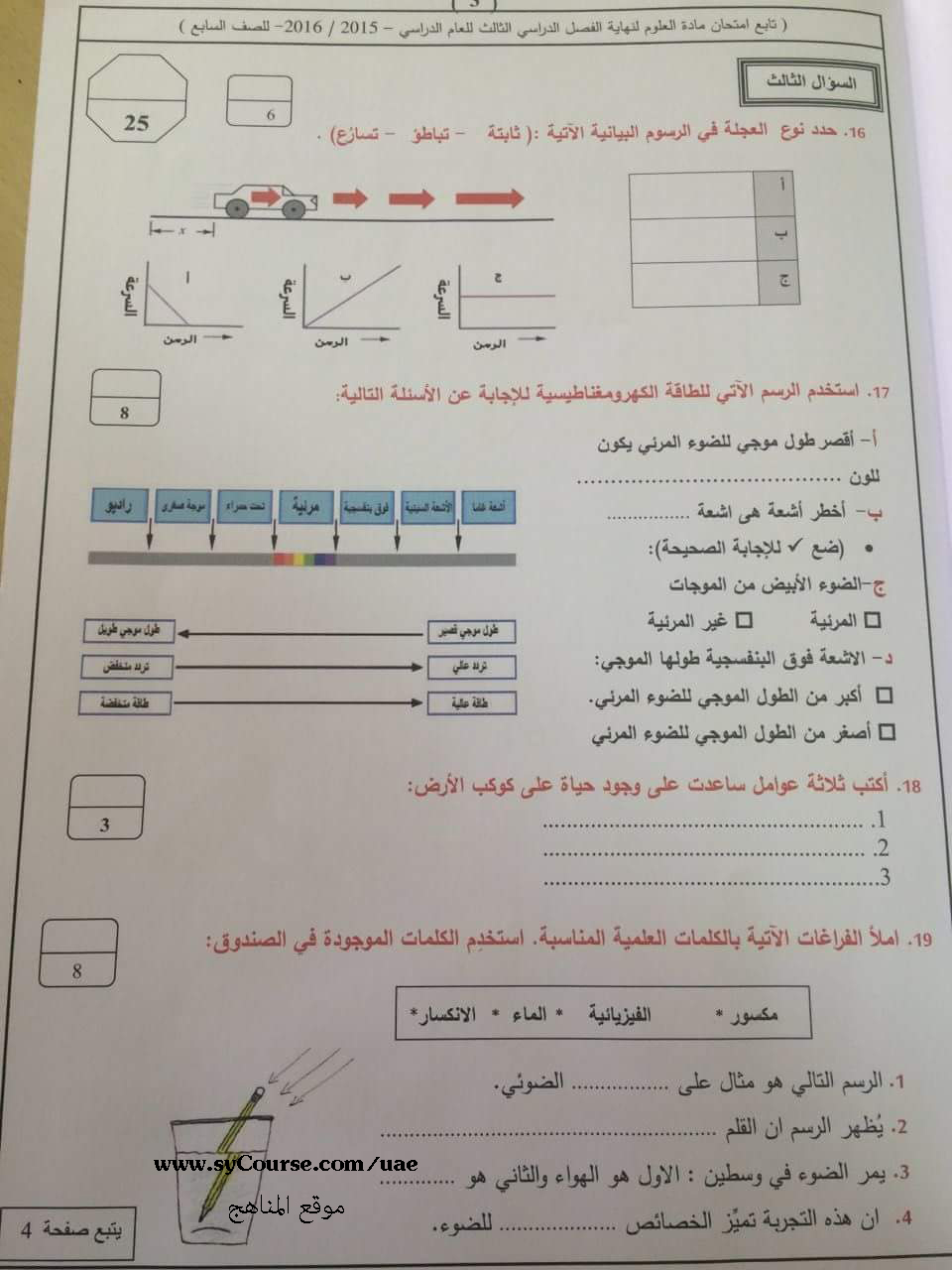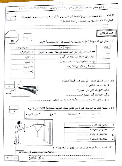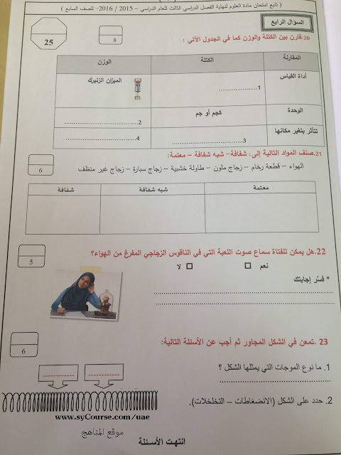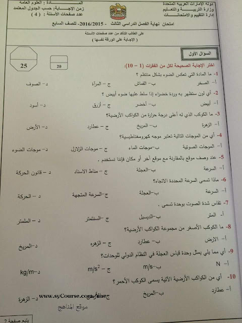 معلومات الملف: الصف السابع, الفصل الثالث, علوم, اسئلة الامتحان نهاية العام 2016 | ||