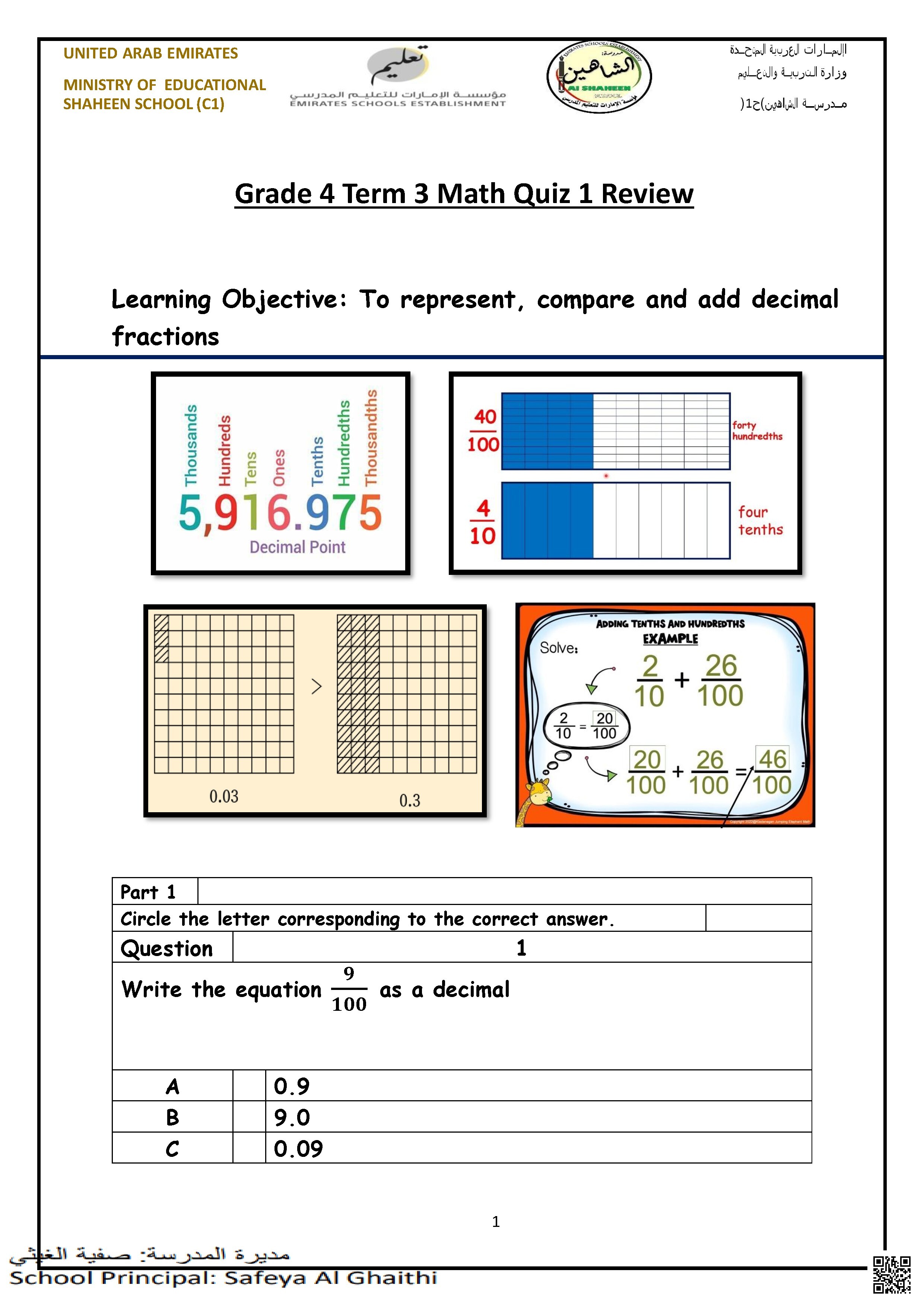 اختبار كويز3 Quiz 1 answer Unit 12 غير محلول بحسب الصف الرابع في مادة الرياضيات – الفصل الثالث