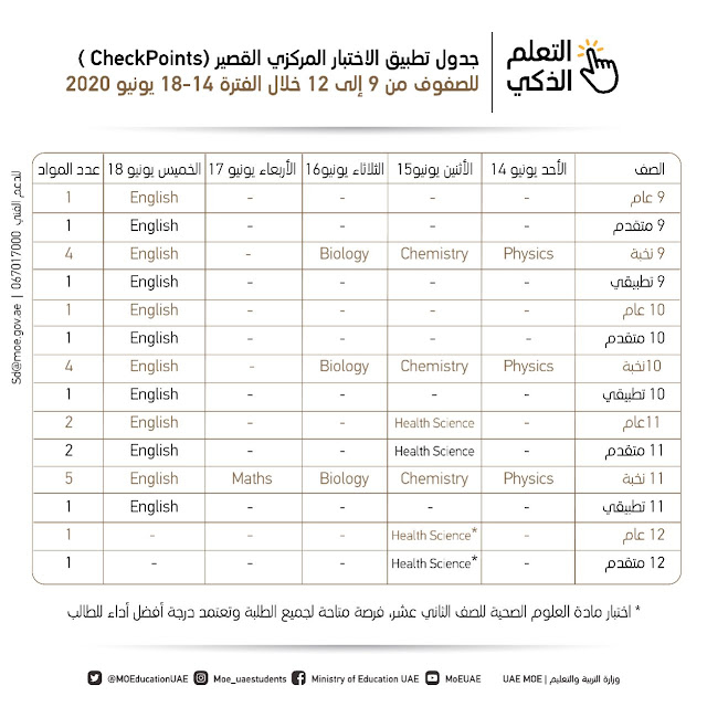 وزارة التربية والتعليم تعلن عن جدول تطبيق الاختبارات المركزية القصيرة (CheckPoints ) للصفوف من 9 – 12 للمدارس الحكومية،والمدارس الخاصة المطبقة لمنهاج الوزارة، خلال الفترة 14- 18 يونيو 2020
