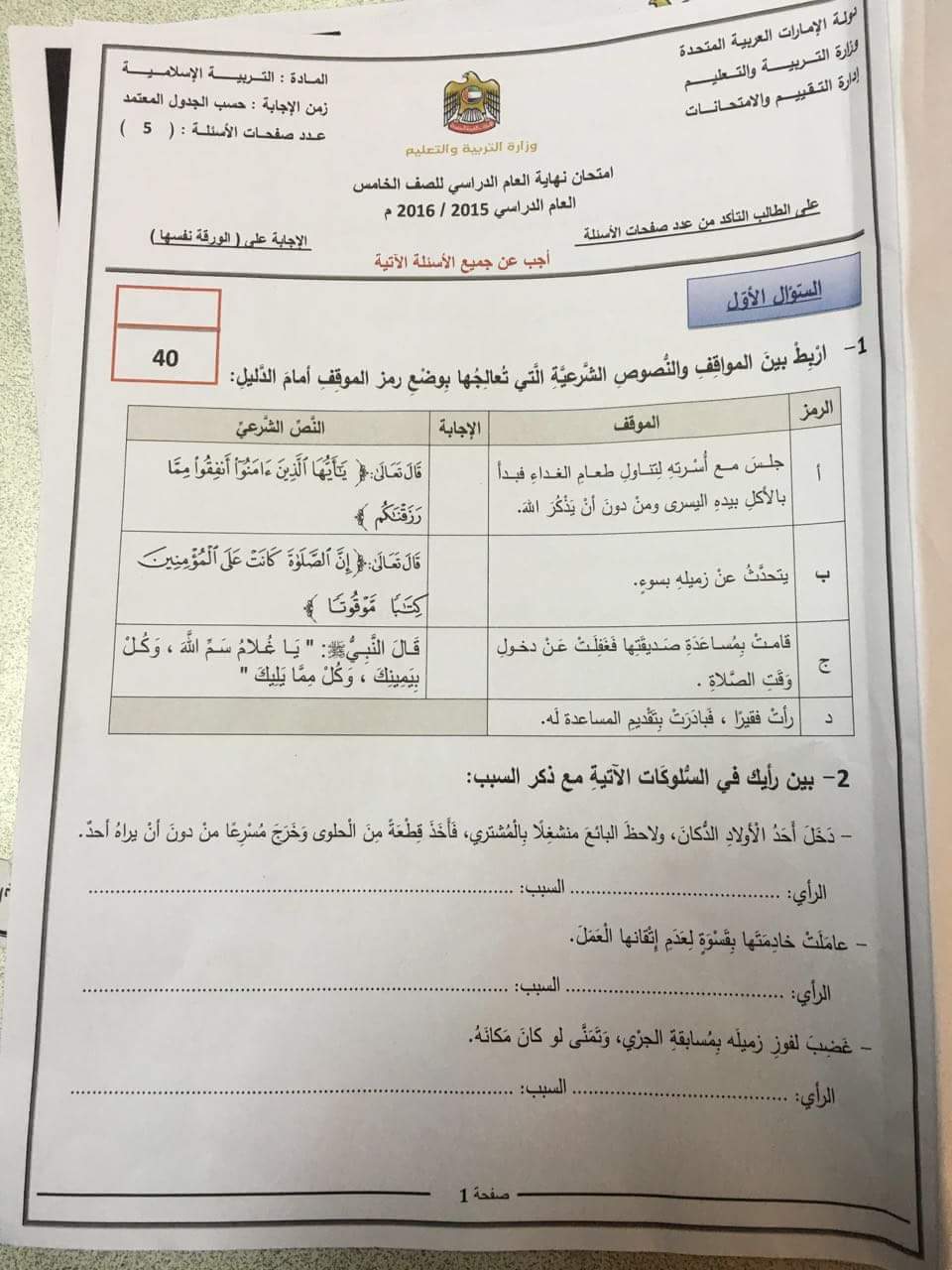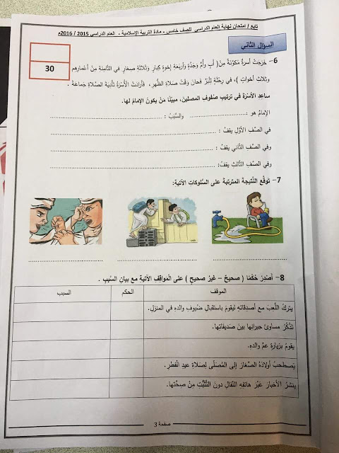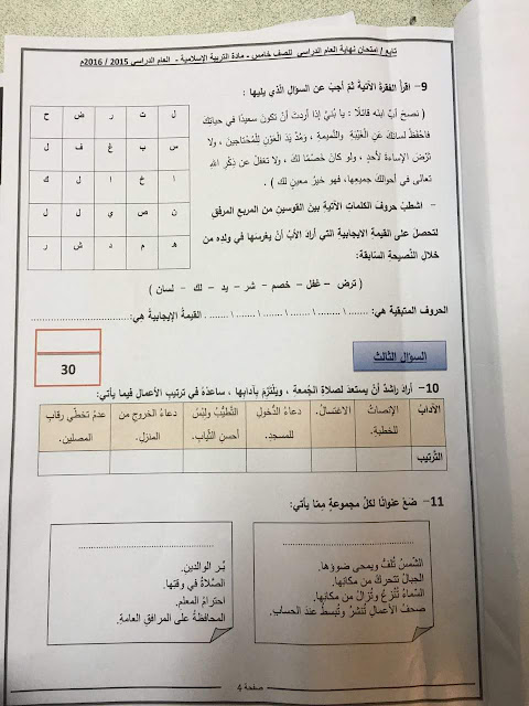 الصف الخامس, الفصل الثالث, تربية اسلامية, امتحان نهاية العام 2015\2016 | ||