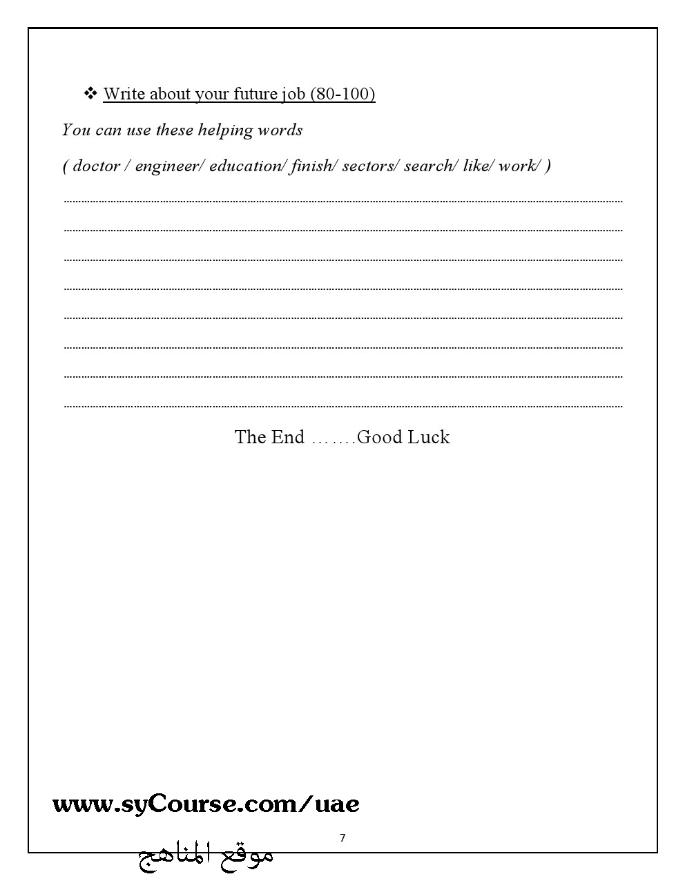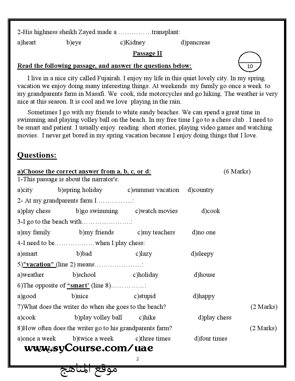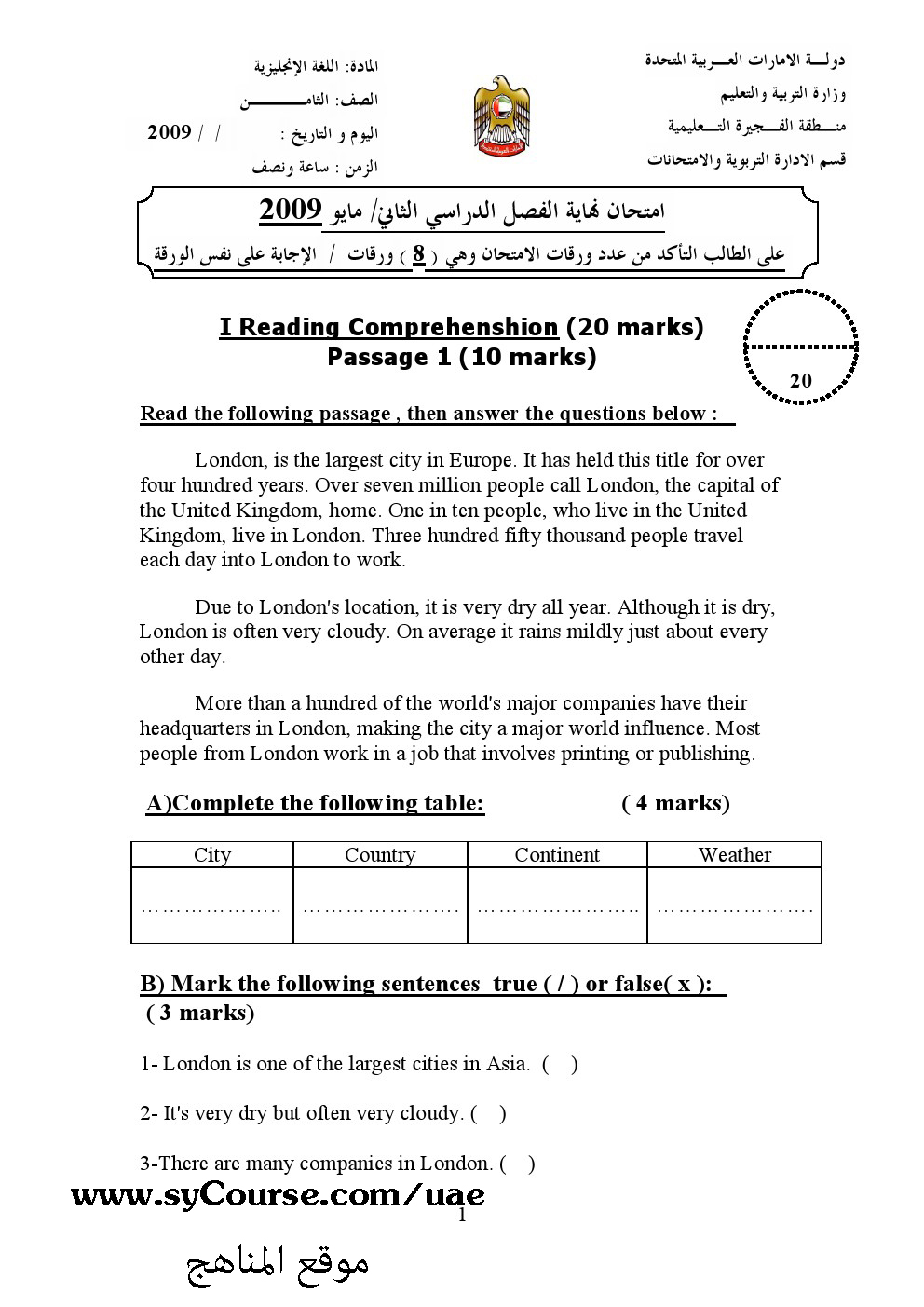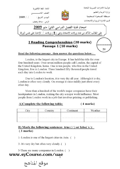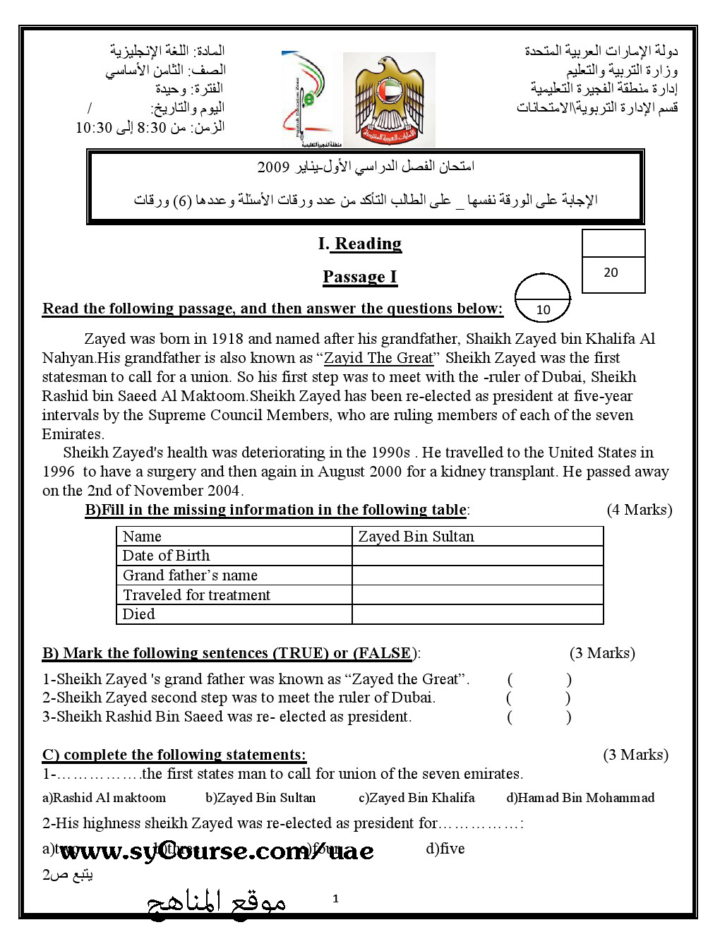 معلومات الملف: الصف الثامن, الفصل الثاني, لغة انكليزية, امتحان لغة انكليزية 2010-2012 | ||
