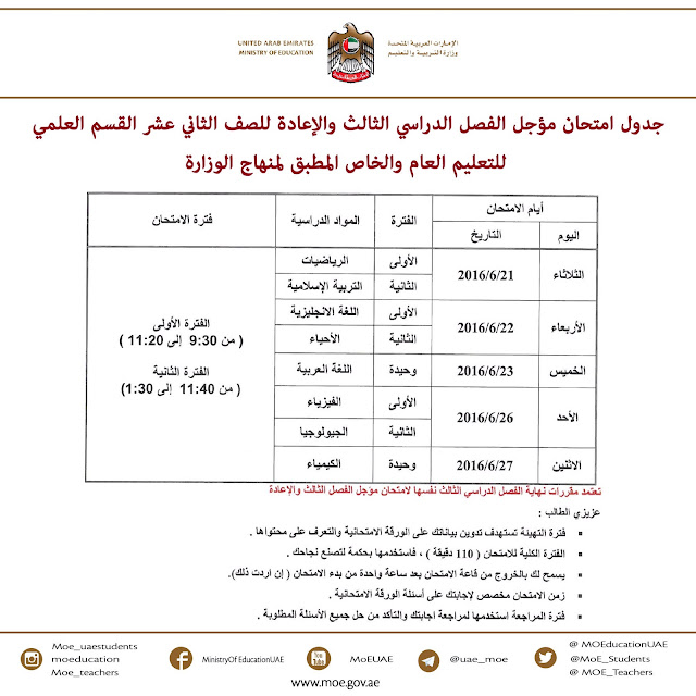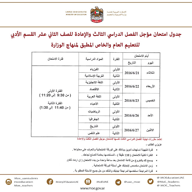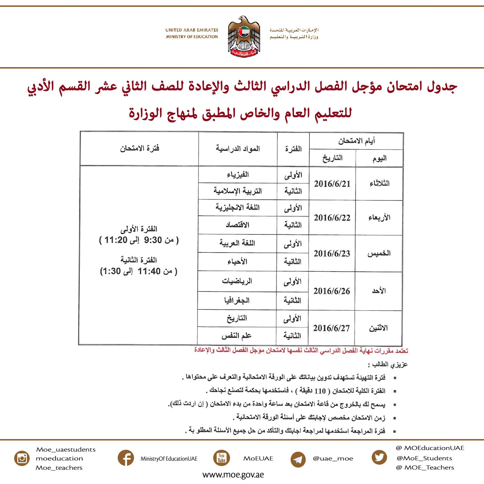 جدول امتحان مؤجل للفصل الثالث والإعادة للصف الثاني عشر أدبي وعلمي عام وخاص مطبق للوزارة2016 | ||
