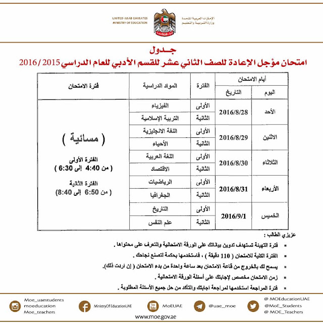 أعلنت وزارة التربية على صفحتها على فيسبوك عن اتاحرة الفرصة لطلبة الصف الثاني عشر لاعادة الاختبارات في 28 أغسطس المقبل, ونقتبس مما جاء على الصفحة: " التربية" تتيح لطلبة 12 الذين لم يتمكنوا من اجتياز الاختبارات النهائية للفصل الدراسي الثالث وامتحان "الإعادة" للعام 2015-2016 فرصة نهائية لإعادة الاختبارات في 28 اغسطس المقبل يشمل القرار طلبة المدارس الحكومية والخاصة المطبقة لمنهاج الوزارة على مستوى الدولة فضلاً عن طلبة تعليم الكبار والدراسة المنزلية تأتي هذه الخطوة في سياق تكريس الممارسات التي من شأنها تحقيق مصلحة الطلبة بما يضمن لهم فرصاً أخرى يستطيعون عبرها تحقيق النجاح الدراسي سيتم ابلاغ الطلبة بمواعيد امتحانات جدول الاعادة عبر النظام الالكتروني، والرسائل النصية القصيرة، وتطبيق "ملفي" و"أبنائي"، والبريد الالكتروني"
