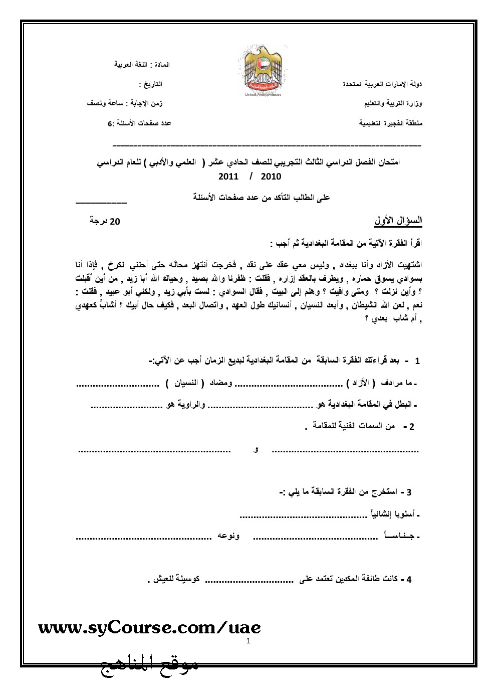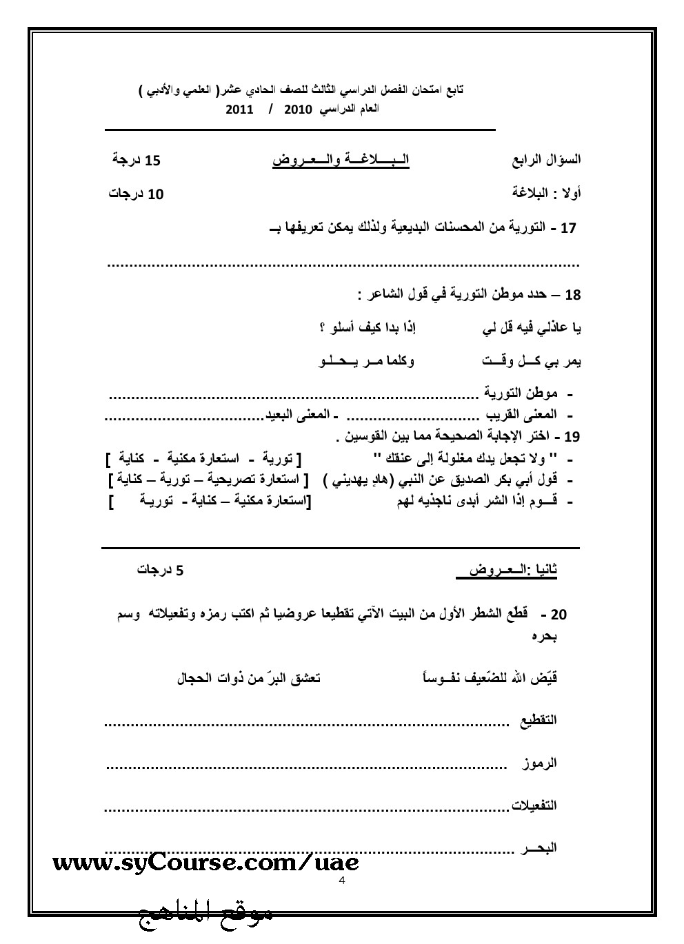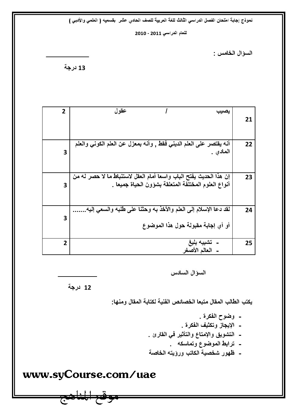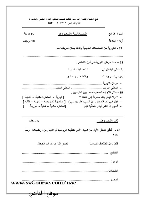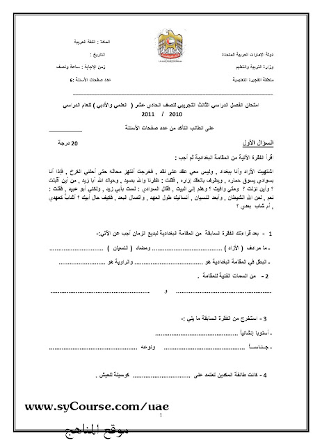 | العلمي والادبيالفصل الثالث امتحان اللغة العربية 2011 مع الحل | ||