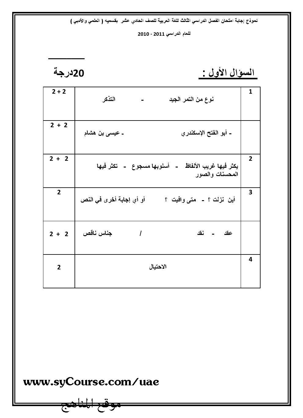 معلومات الملف: الصف الثاني عشر العلمي والادبي-الفصل الثالث- امتحان اللغة العربية 2011 مع الحل | ||