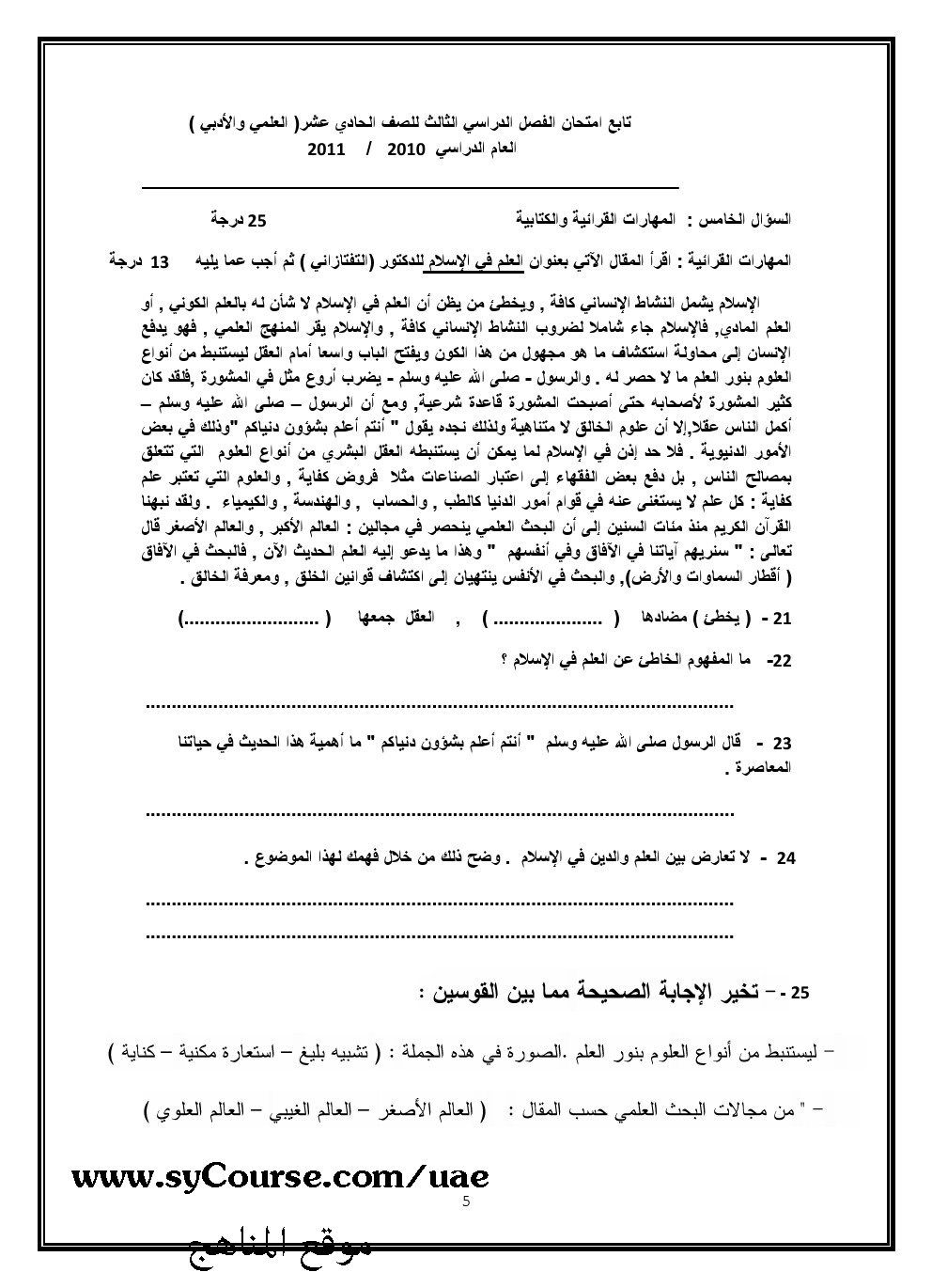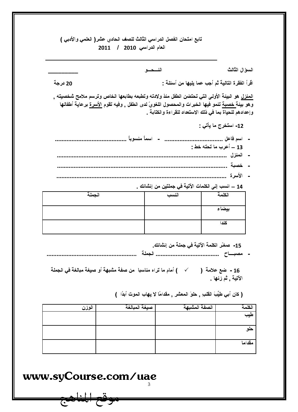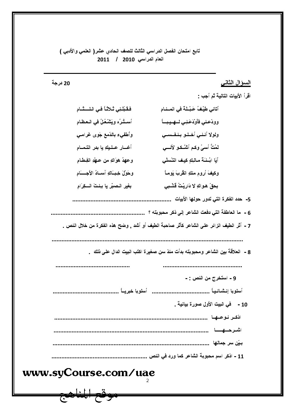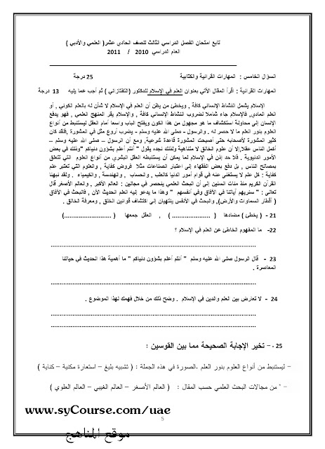 العلمي والادبيالفصل الثالث امتحان اللغة العربية 2011 مع الحل | ||
