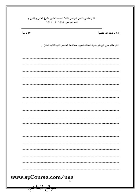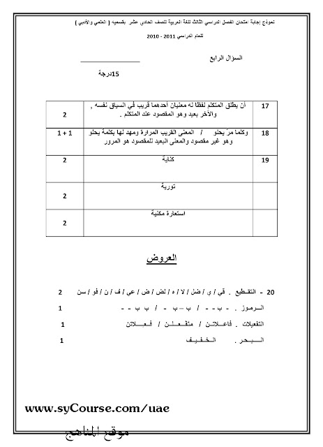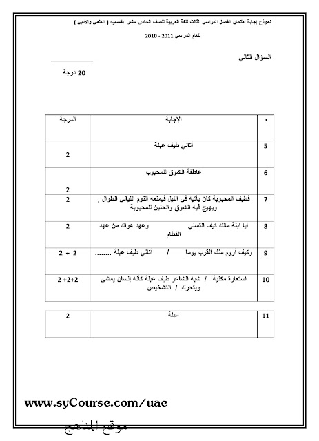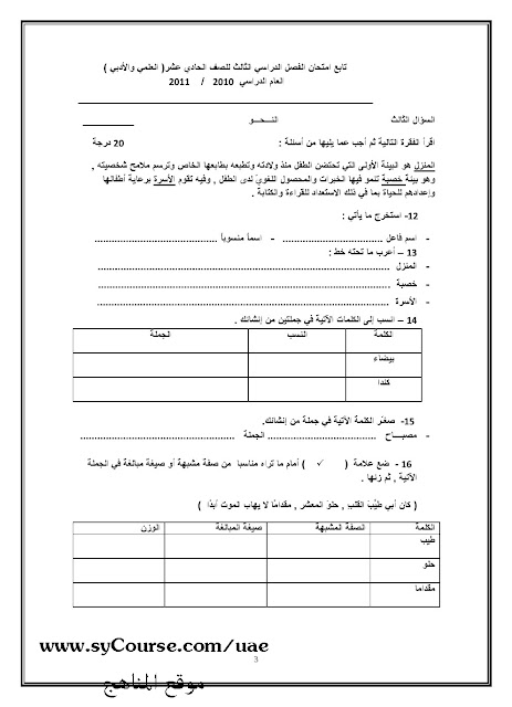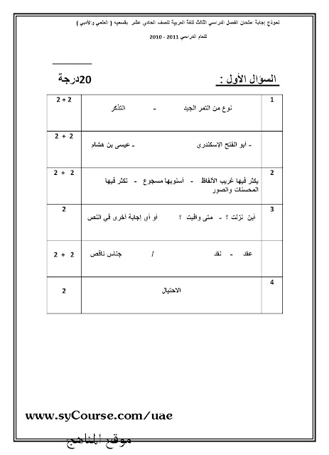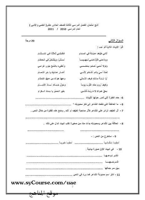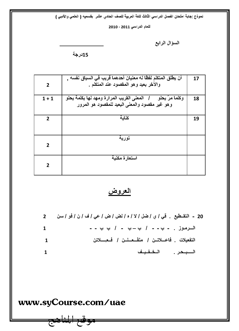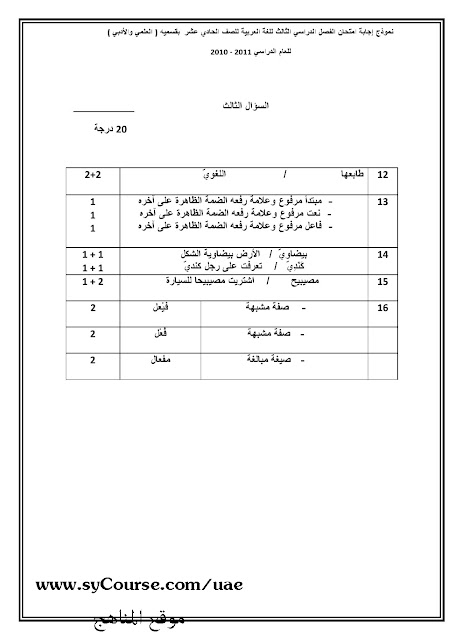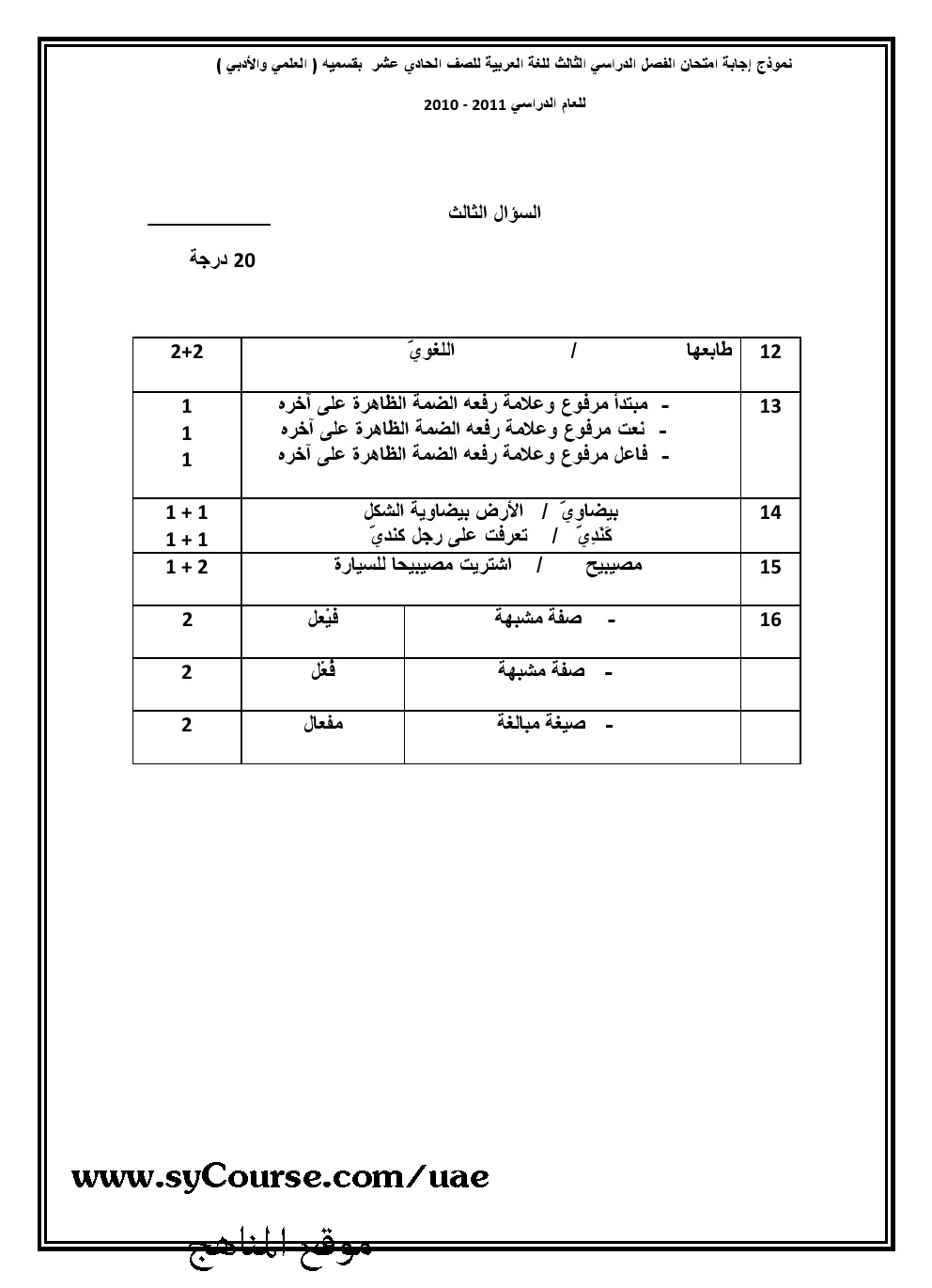 العلمي والادبيالفصل الثالث امتحان اللغة العربية 2011 مع الحل | ||