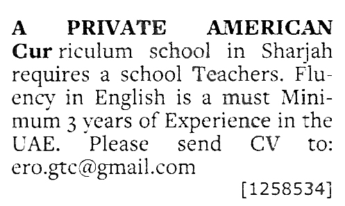 أعلنت مدرسة خاصة في امارة الشارقة تتبع المنهج الامريكي عبر Khaleej Times بتاريخ 14\7\2016 عن حاجتها لمدرسين واشترطت حد أدنى للخبرة ثلاث سنوات