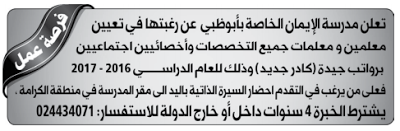 أعلنت مدرسة الايمان الخاصة في أبو ظبي عبر جريدة الوسيط عن نيتها تجديد الكادر التدريسي لديها للعام الدراسي 2016\2017, حيث طلبت معلمين ومعلمات من جميع الاختصاصات وذلك كما هو موضح في الاعلان التالي:
