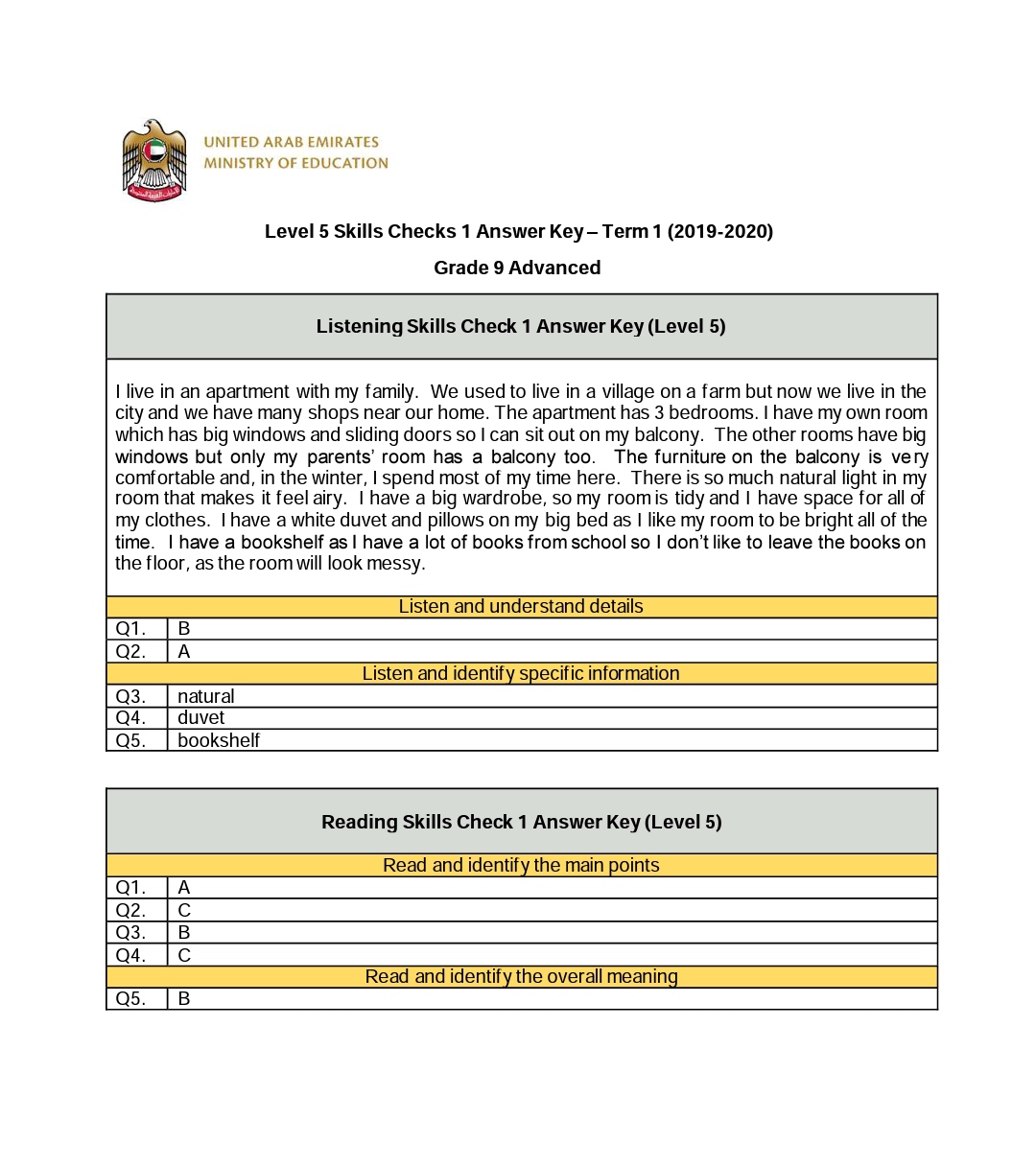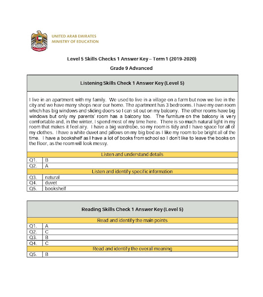 نرفق لكم ملف يتضمن اوراق عمل  level5 skillschecks 1 من مادة لغة انجليزية  للصف التاسع المتقدم مع الحل الفصل الدراسي الأول للعام الدراسي 2020-2019