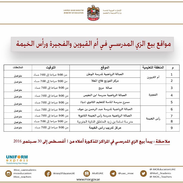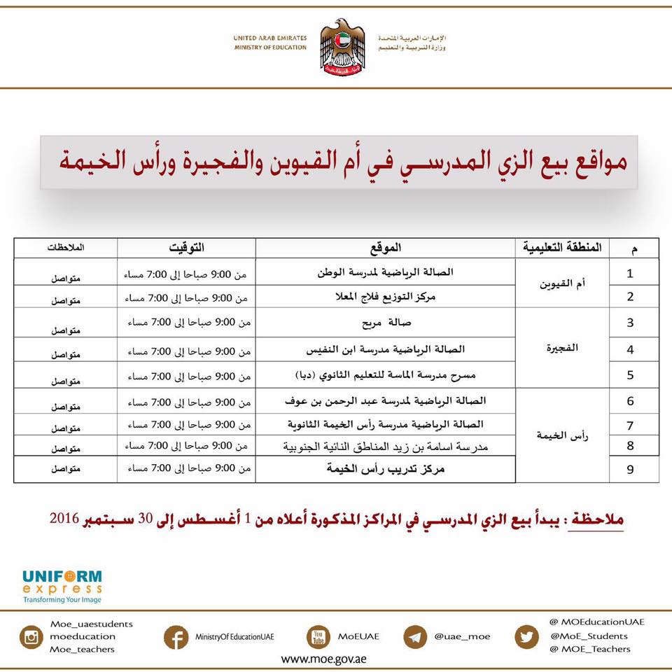 نشرت صفحة وزارة التربية والتعليم الاماراتية مواقع بيع الزي المدرسي في جميع الامارات, وإليكم الأماكن في أم القيوين والفجيرة ورأس الخيمة: