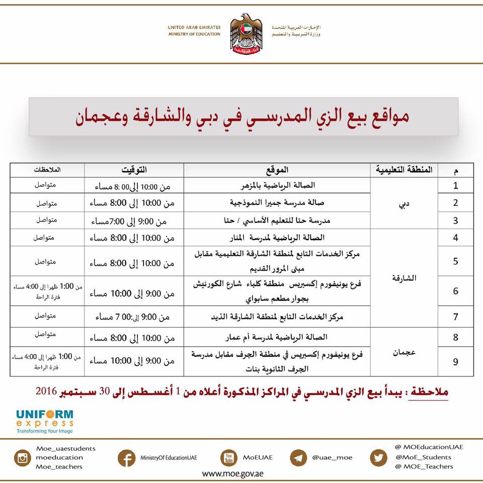 نشرت وزارة التربية والتعليم في الامارات عبر صفحتها الرسمية على فيسبوك أماكن وتواقيت بيع الزي المدرسي في جميع الامارات وإليكم أماكن وتواقيت البيع في كلٍ من دبي والشارقة وعجمان, حيث يبدأ البيع في 1 أغسطس وينتهي في 30 سبتمبر