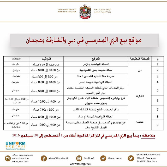 أماكن وأوقات بيع الزي المدرسي في كلٍ من دبي والشارقة وعجمان 2017, أخبار, أخبار, الفصل الأول, 2016-2017 | ||
