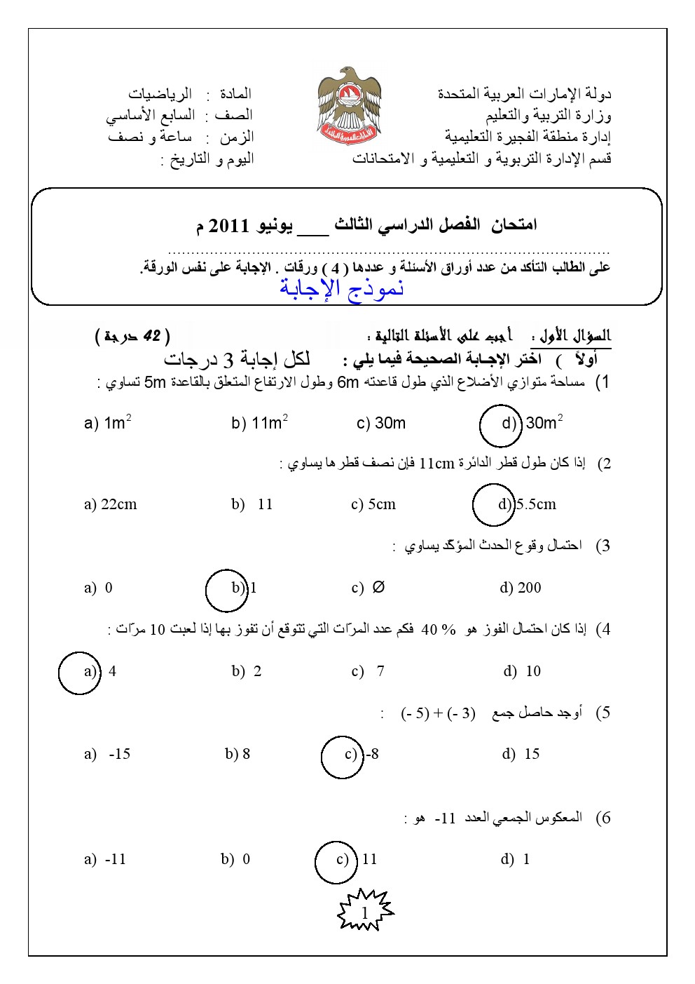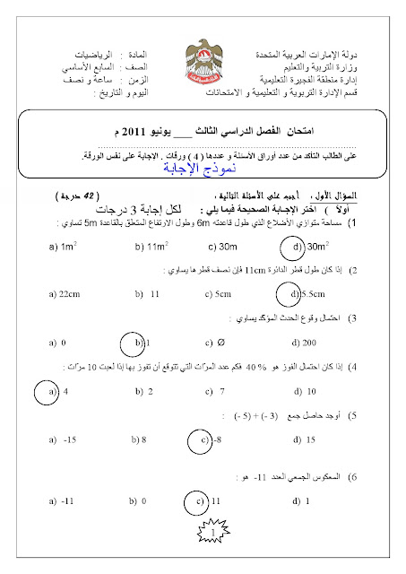 | معلومات الملف: الصف السادس, الفصل الثالث, رياضيات, امتحان نهاية العام 2011 مع الحل | ||
