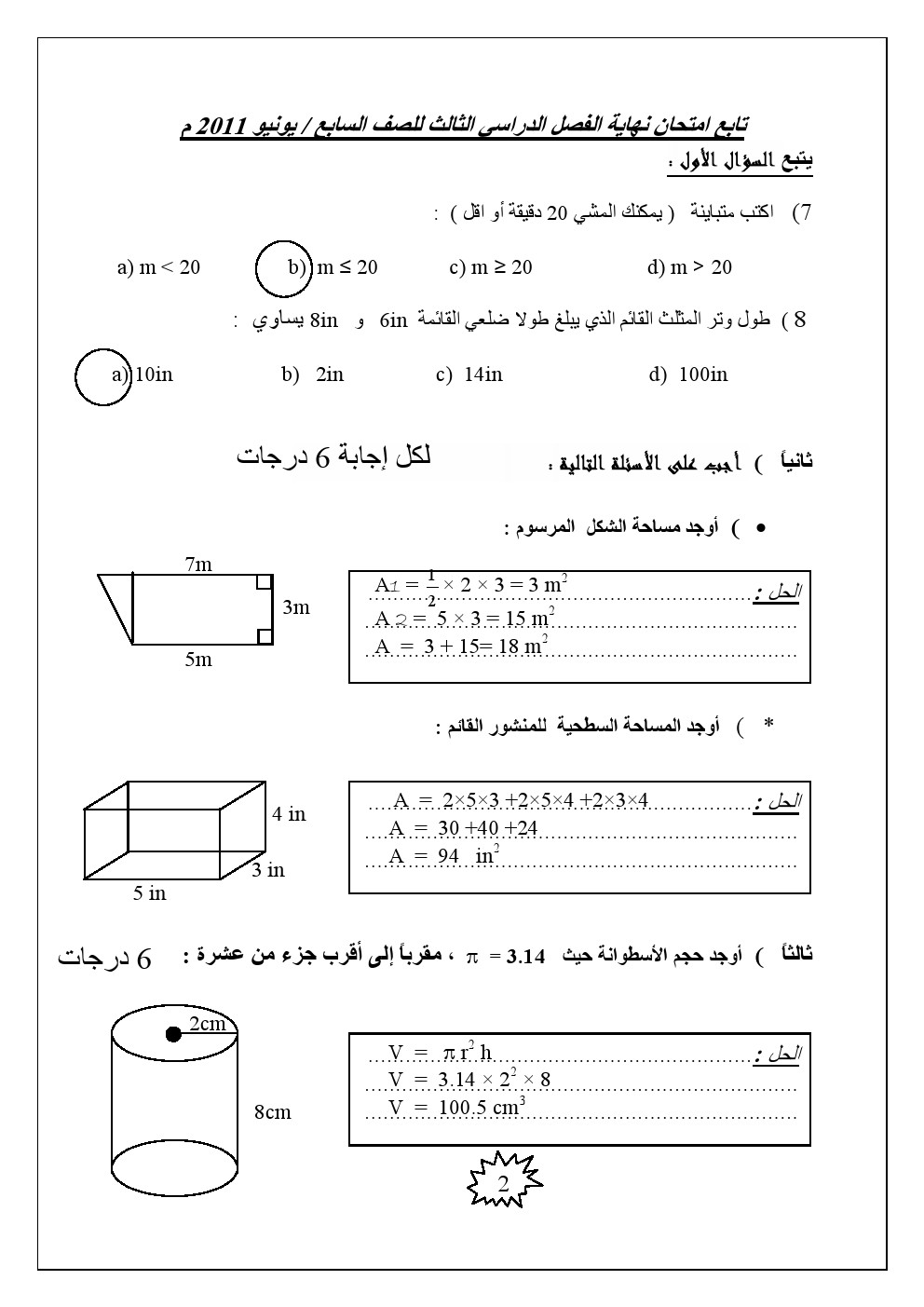 معلومات الملف: الصف السادس, الفصل الثالث, رياضيات, امتحان نهاية العام 2011 مع الحل | ||