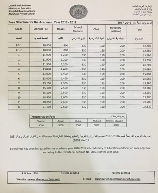 الرسوم الدراسية بعد الزيادة لمدرسة الزهور الخاصة في الشارقة 2017 (بالتفصيل) | ||