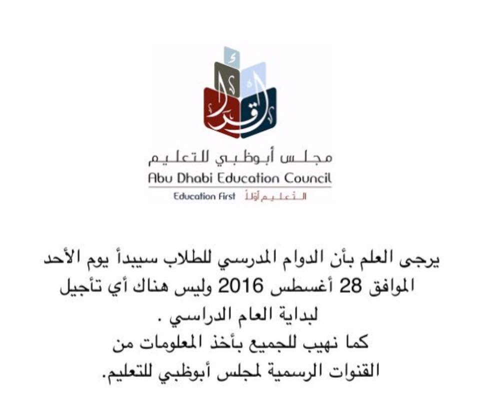 أكد مجلس أبو ظبي للتعليم أن موعد بدء العام الدراسي 2016\2017 هو 28 أغسطس وأنه لا يوجد تأجيل في الموعد كما شدد على عدم الأخذ بأية أخبار متداولة حول تأجيل الموعد: