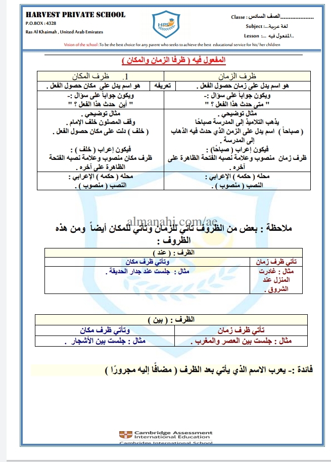 معلومات الملف: يحتوي هذا الملف على حل أوراق عمل لدرس المفعول فيه للصف السادس: المفعول فيه ينقسم إلى ظرف الزمان وهو أسم يدل على زمان حصول الفعل ويكون جواباً على سؤال (متى حدث الفعل؟) ويكون حكمه الإعرابي (منصوب). ظرف المكان وهو اسم يدل على مكان حصول الفعل ويكون جواباً لسؤال (أين حدث هذا الفعل) ويكون حكمه الإعرابي (منصوب) وبعض الظروف تأتي للزمان وتأتي للمكان أيضاً، يعرب الأسم الذي يأتي بعد الظرف (مضافاً إليه مجروراً). يقدم الملف أيضاً الملف إجابة عدد من الأسئلة مثل: وضع خط تحت المفعول فيه في الجمل التالية مع تبيان نوعه، إعراب جمل إعرابا تاماً مثل "شرب المريض الدواء ليلا" و" جلس الحارس أمام العمارة" و" الصباح جميل" و" حضر أحمد يوم الأحد"، اختيار الإجابة الصحيحة من بين الأقواس.
