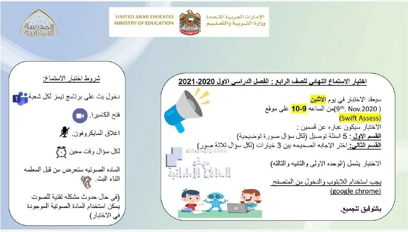 معلومات الملف: حددت بعض المدارس تاريخ التاسع من نوفمبر موعداً لاختبار الاستماع في اللغة الانجليزية وذلك للصف التاسع، كما أوردت شروط تقديم هذا الامتحان وهي كالتالي: فتح الكاميرا. اغلاق المايكرفون. لكل سؤال وقت معين. المادة الصوتية ستعرض من قبل المعلمة أثناء البث. | ||
