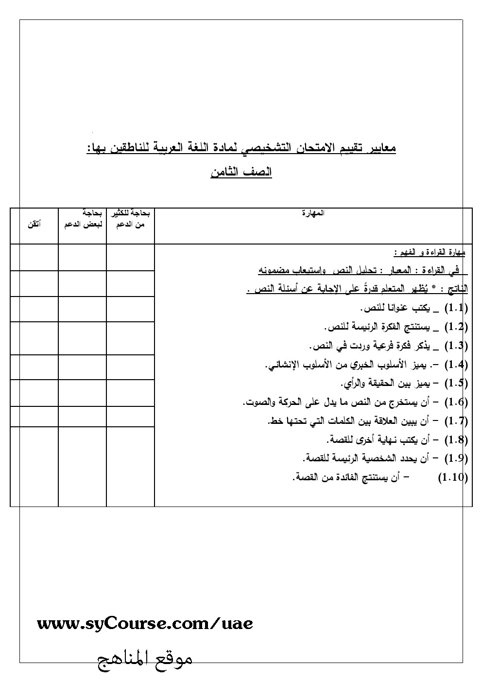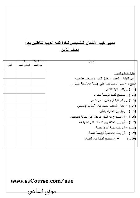 معايير تقييم الامتحان التشخيصي لمادة اللغة العربية للناطقين بها | ||