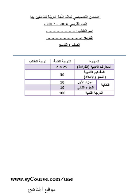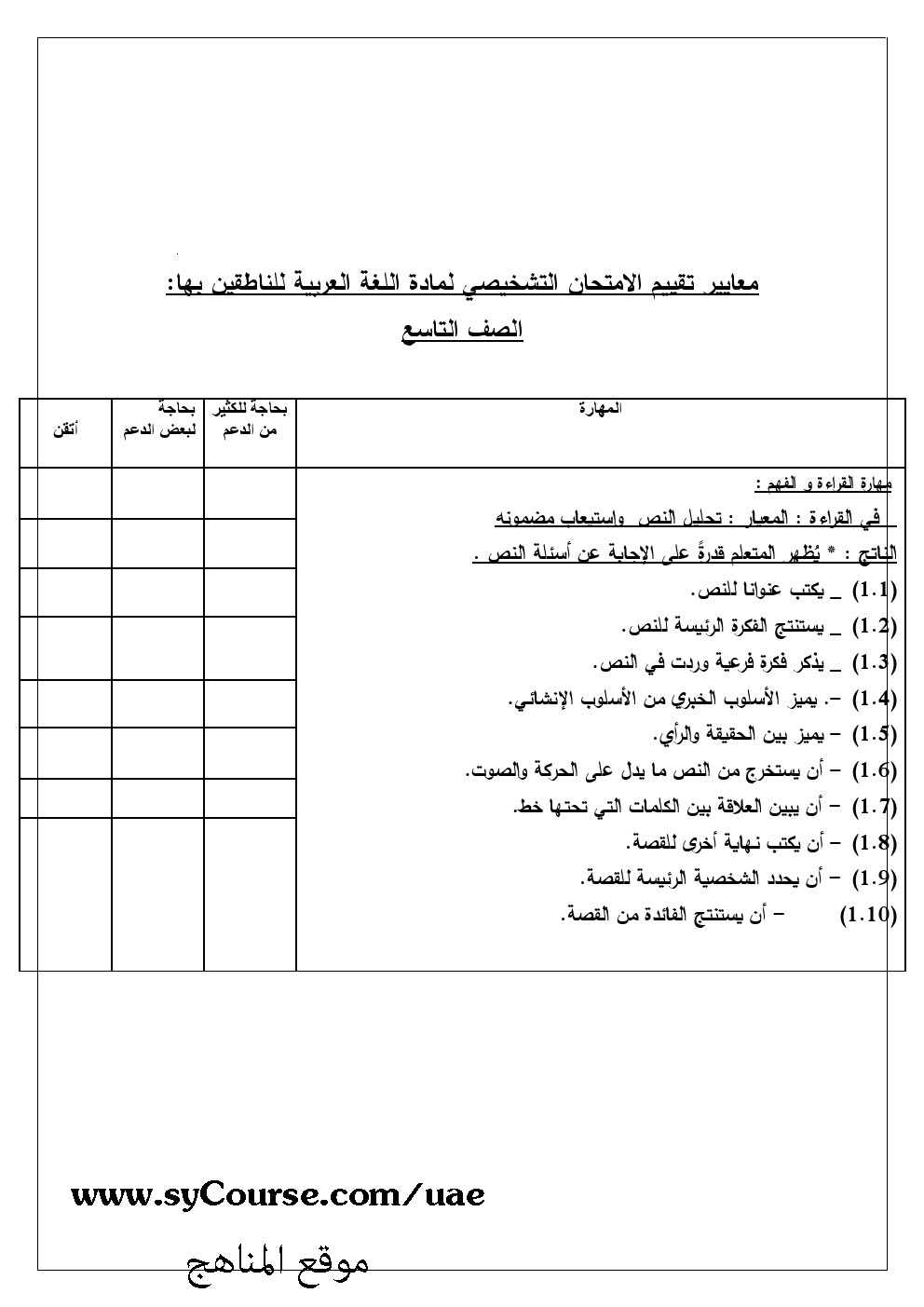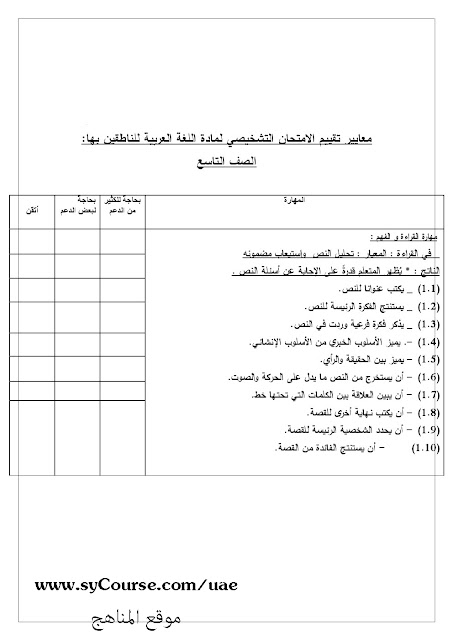 إليكم معايير تقييم الامتحان التشخيصي لمادة اللغة العربية للناطقين بها للصف التاسع - منهاج اماراتي- على شكل صور: