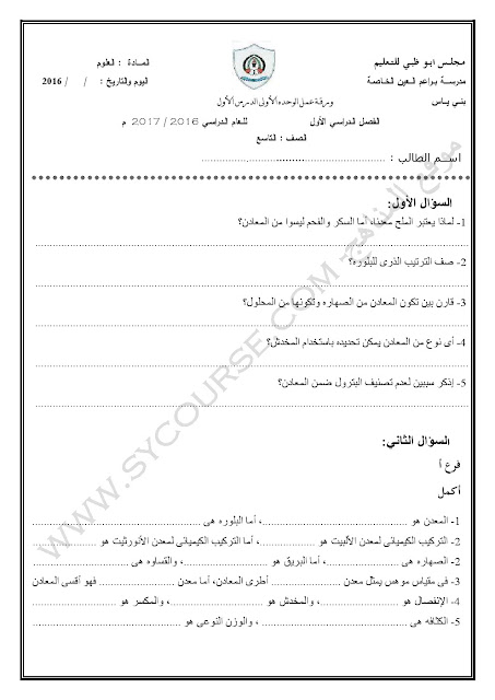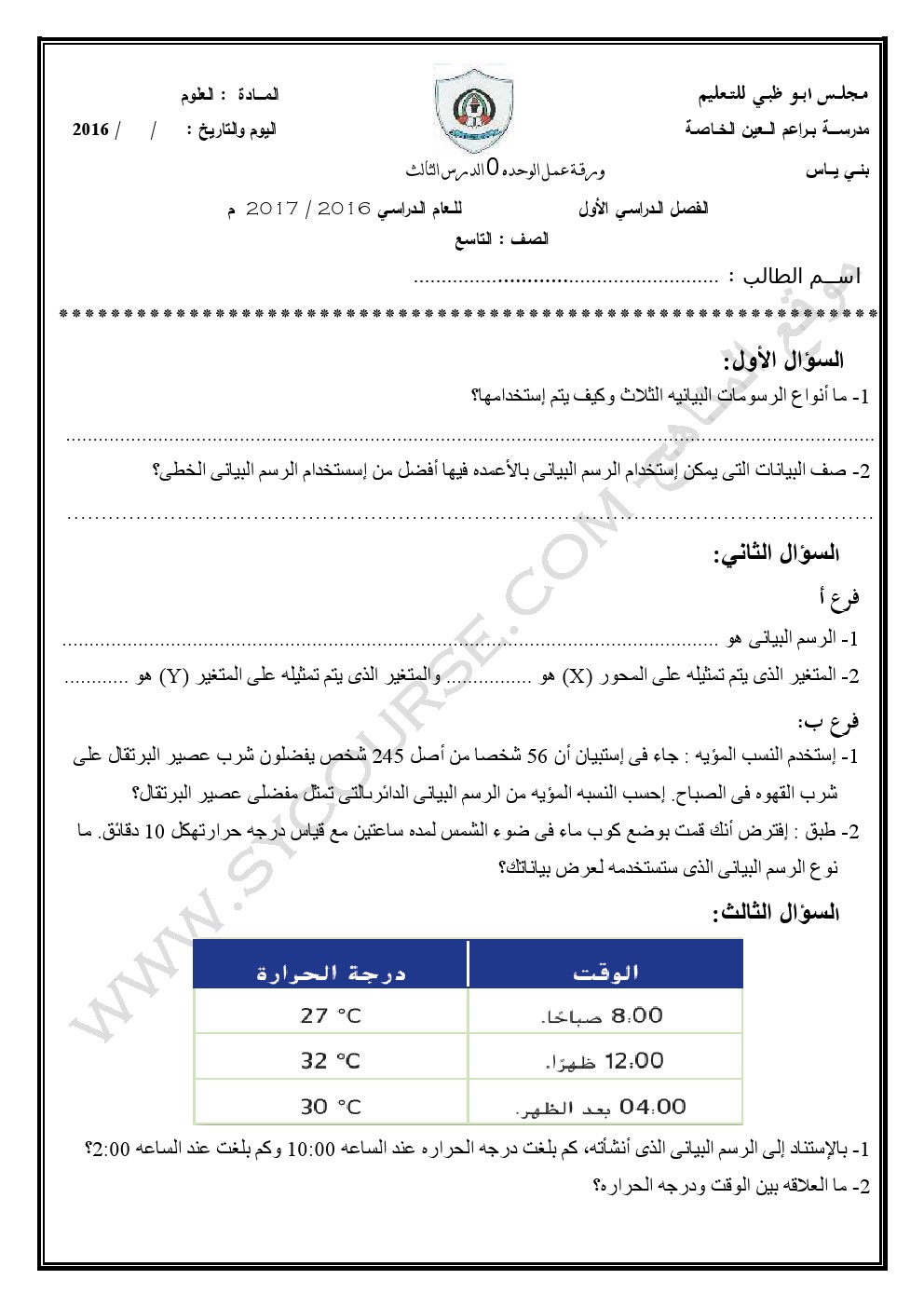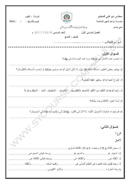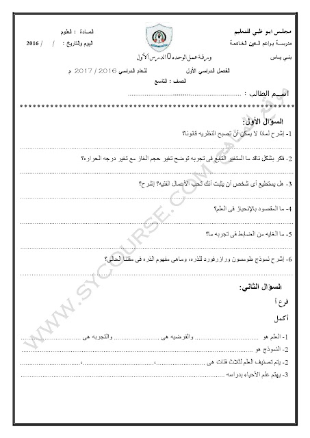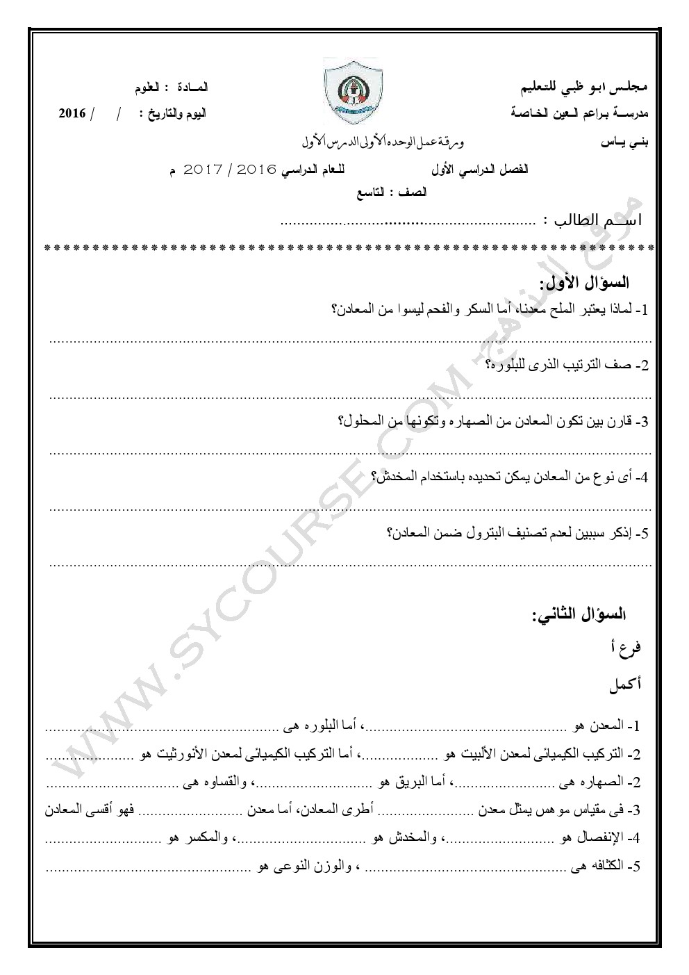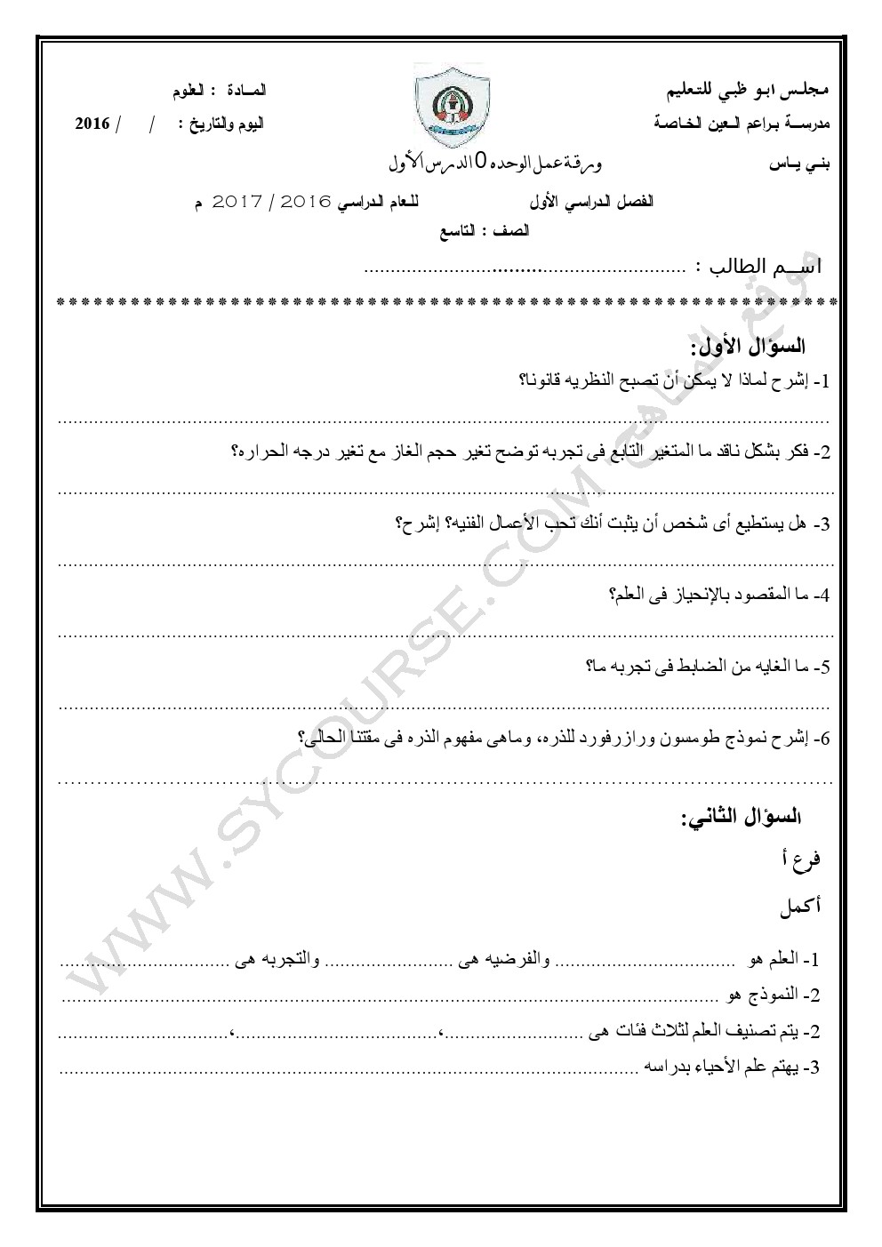 أوراق عمل في مادة العلوم للصف التاسع وفق المنهاج الاماراتي للعام الدراسي 2016-2017 المصدر/ مدرسة براعم العين