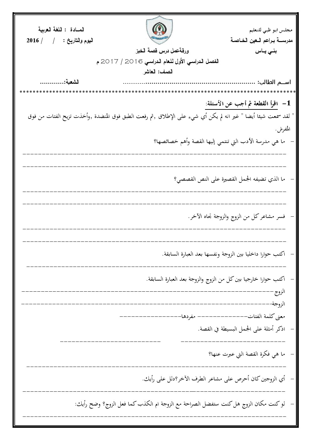 معلومات الملف: الصف العاشر, الفصل الأول, لغة عربية, ورقة عمل درس قصة الخبز 2016-2017 | ||