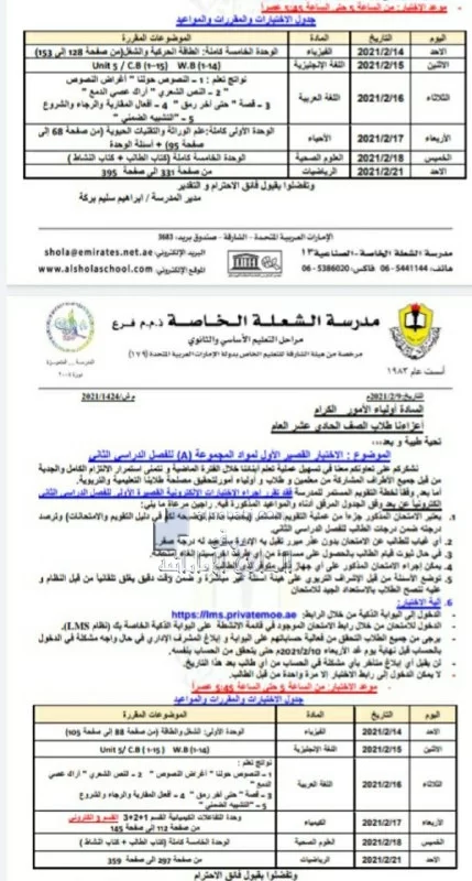 معلومات الملف: إليكم ضمن الملف المرفق أدناه جدولين للاختبارات والمقررات والمواعيد للاختبارات القصيرة وذلك للصف الحادي عشر بقسميه العام والمتقدم في مدرسة الشعلة الخاصة، لمواد المجموعة (A)، وسيتم إجراء هذه الاختبارات عن بعد. | ||