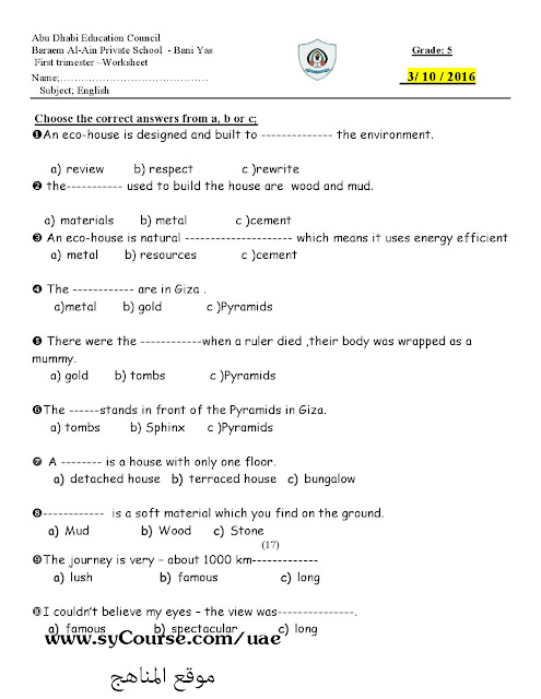 الصف الخامس- لغة انكليزية -الفصل الأول- ورقة العمل الاولى 2016-2017 وفق المنهاج الاماراتي |