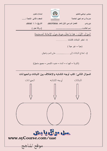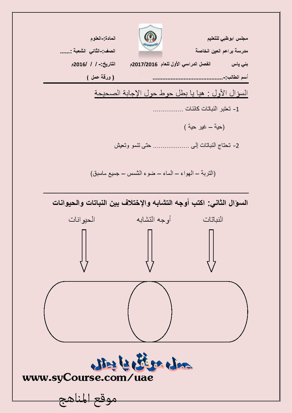 الصف الثاني- علوم- ورقة عمل حول النبات 2016-2017 وفق المنهاج الاماراتي الحديث