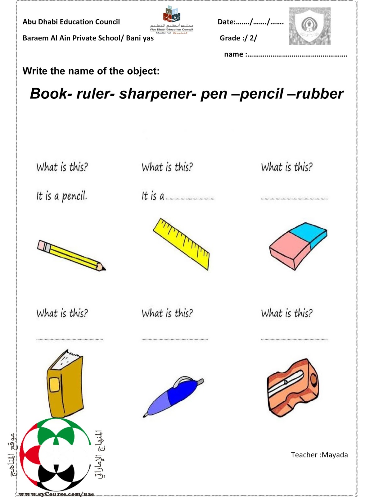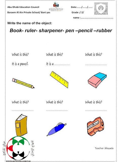 الصف الثاني لغة انكليزية- ورقة عمل حول كتابة أسماء الأشياء 2016-2017 المنهاج الاماراتي