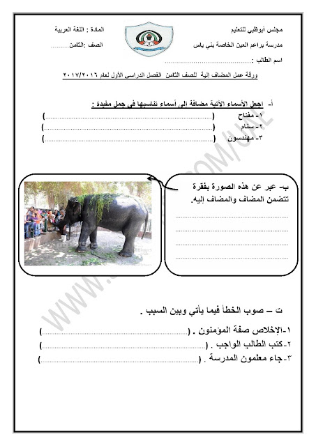 الصف الثامن- لغة عربية- ورقة عمل المضاف 2016-2017 وفق المنهاج الاماراتي الحديث