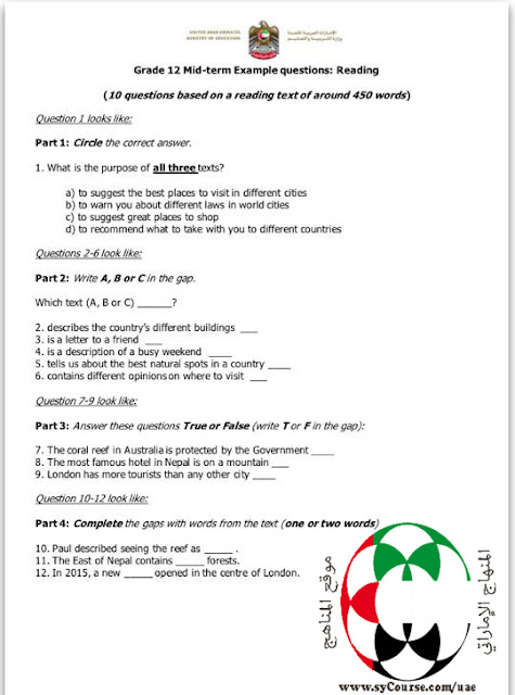 الصف الثاني عشر- لغة انكليزية- نموذج الأسئلة الجديد للعام الدراسي 2016-2017 وفق المنهاج الاماراتي