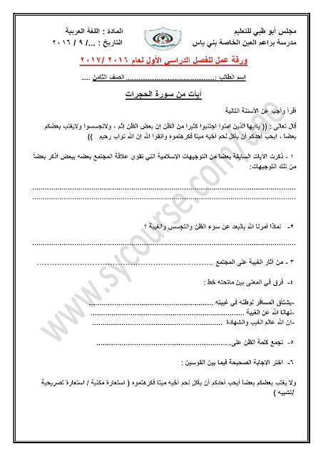 معلومات الملف: الصف الخامس, الفصل الأول, لغة عربية, لغة عربية- ورقة عمل -آيات من سورة الحجرات- 2016-2017 | ||