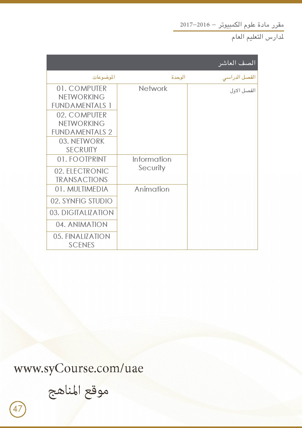 الصف العاشر- توزيع المقررات الدراسية للعام 2016-2017 لجميع المواد وفق المنهاج الاماراتي: