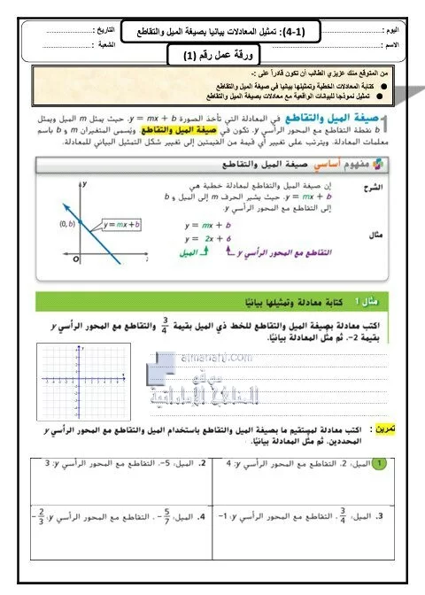 | أوراق عمل تمثيل المعادلات بيانيا بصيغة الميل و التقاطع | ||