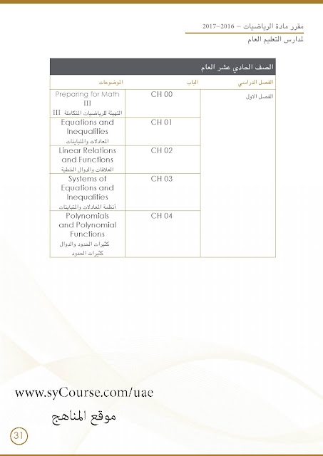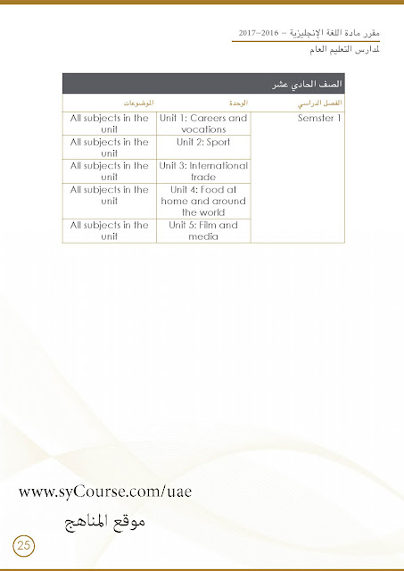 الصف الحادي عشر- توزيع المقررات الدراسية للعام 2016-2017 لجميع المواد وفق المنهاج الاماراتي: