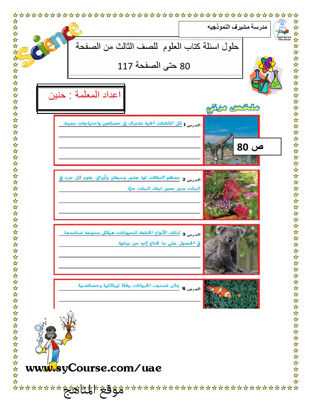 معلومات الملف: الصف الثالث, الفصل الأول, علوم, حل أسئلة الكتاب من ص80 حتى 117 للعام 2016-2017 | ||