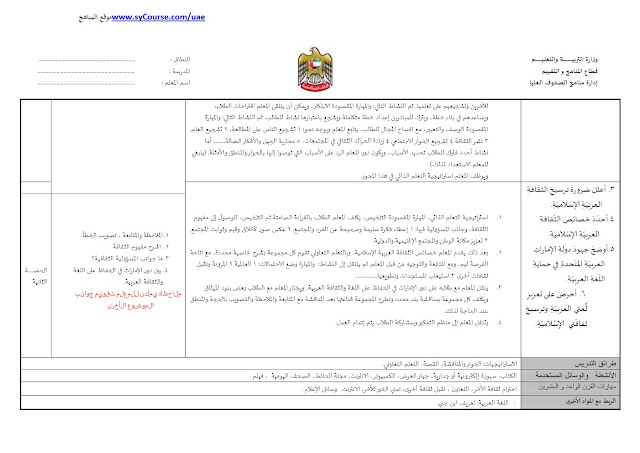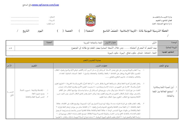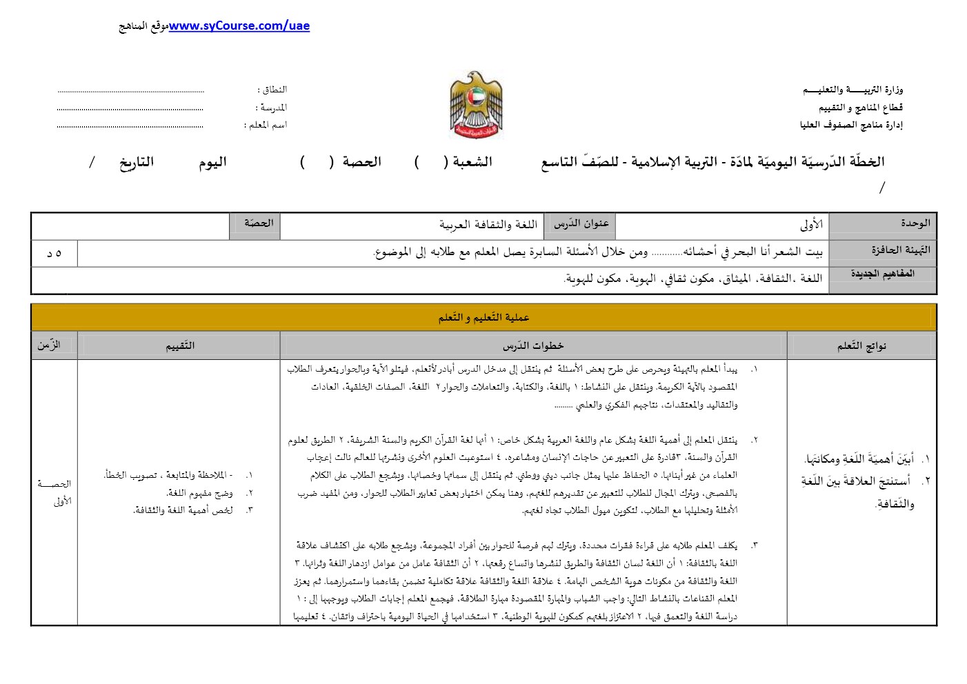 الصف التاسع- لغة عربية- الخطية الدرسية لدرس (اللغة والثقافة العربية) 2016-2017 وفق المنهاج الاماراتي