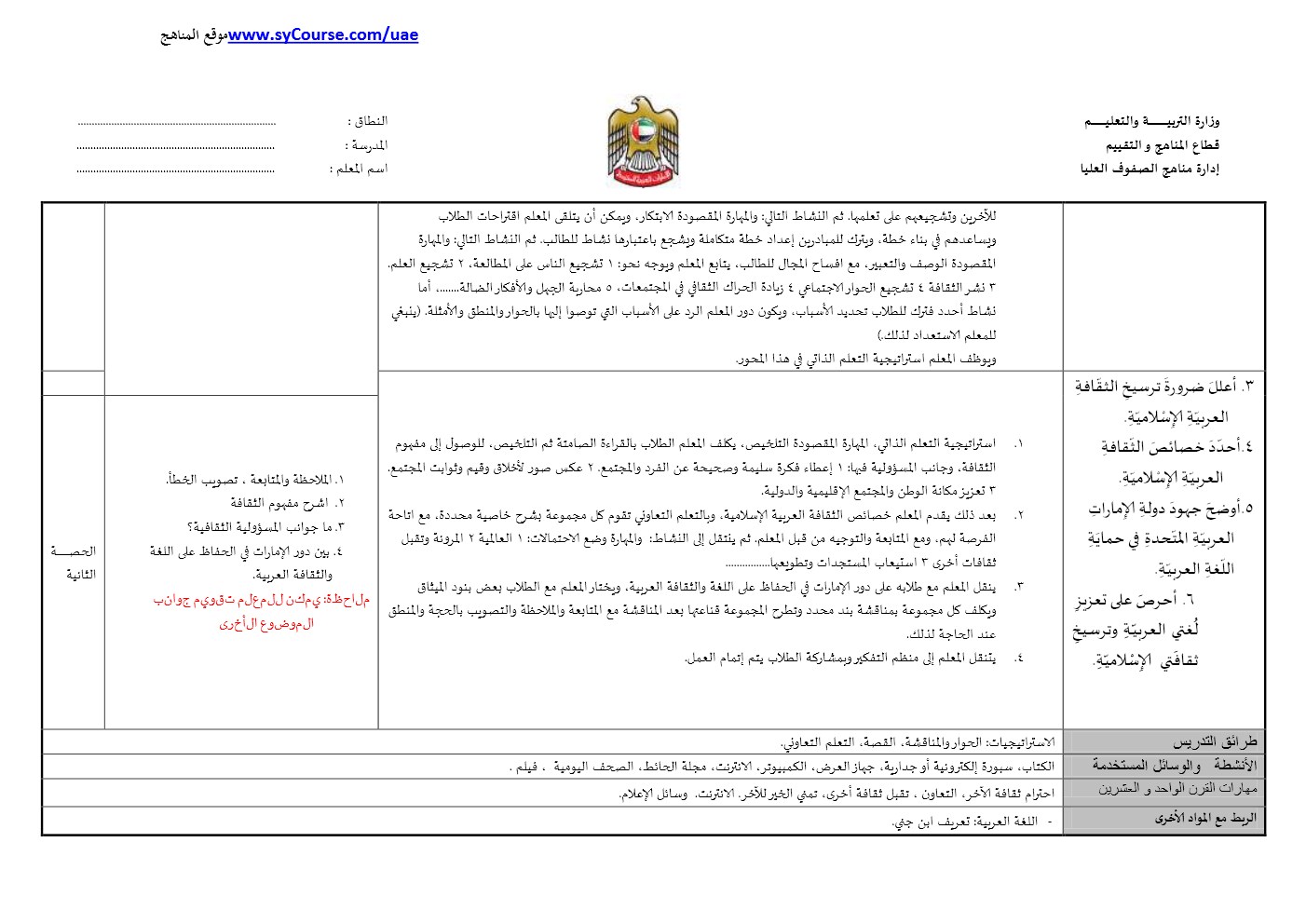 | الخطية الدرسية لدرس (اللغة والثقافة العربية) | ||