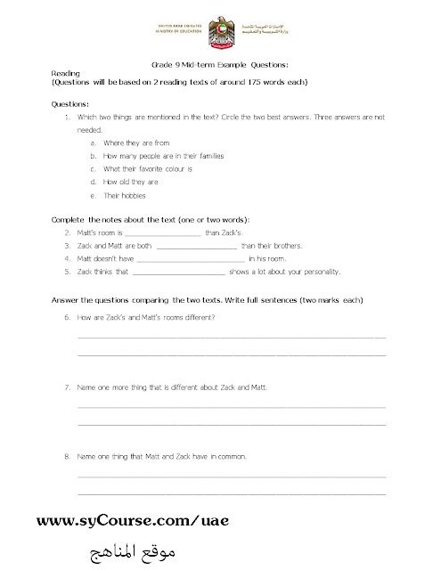 الصف التاسع- لغة انكليزية - نموذج الامتحان الرسمي 2016-2017 وفق المنهاج الاماراتي